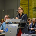 Ook Laura Broekhuizen voerde het woord. Zij nam de eerste dag als burgemeester door. De start in Nieuwolda was overweldigend, schoolkinderen met vlaggetjes en de raad. Daarna door naar De Klinker waar wederom een hartelijk ontvangst was en dan door naar het rosarium voor een ontmoeting met het MT en college. Vele handen werden geschud en deze avond omringt door de ouders van de burgemeester en haar schoonouders, vele genodigden en tot slot kreeg Cora-Yfke Sikkema de ambtsketen door Laura omgehangen.