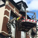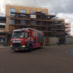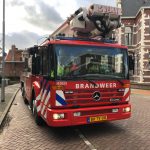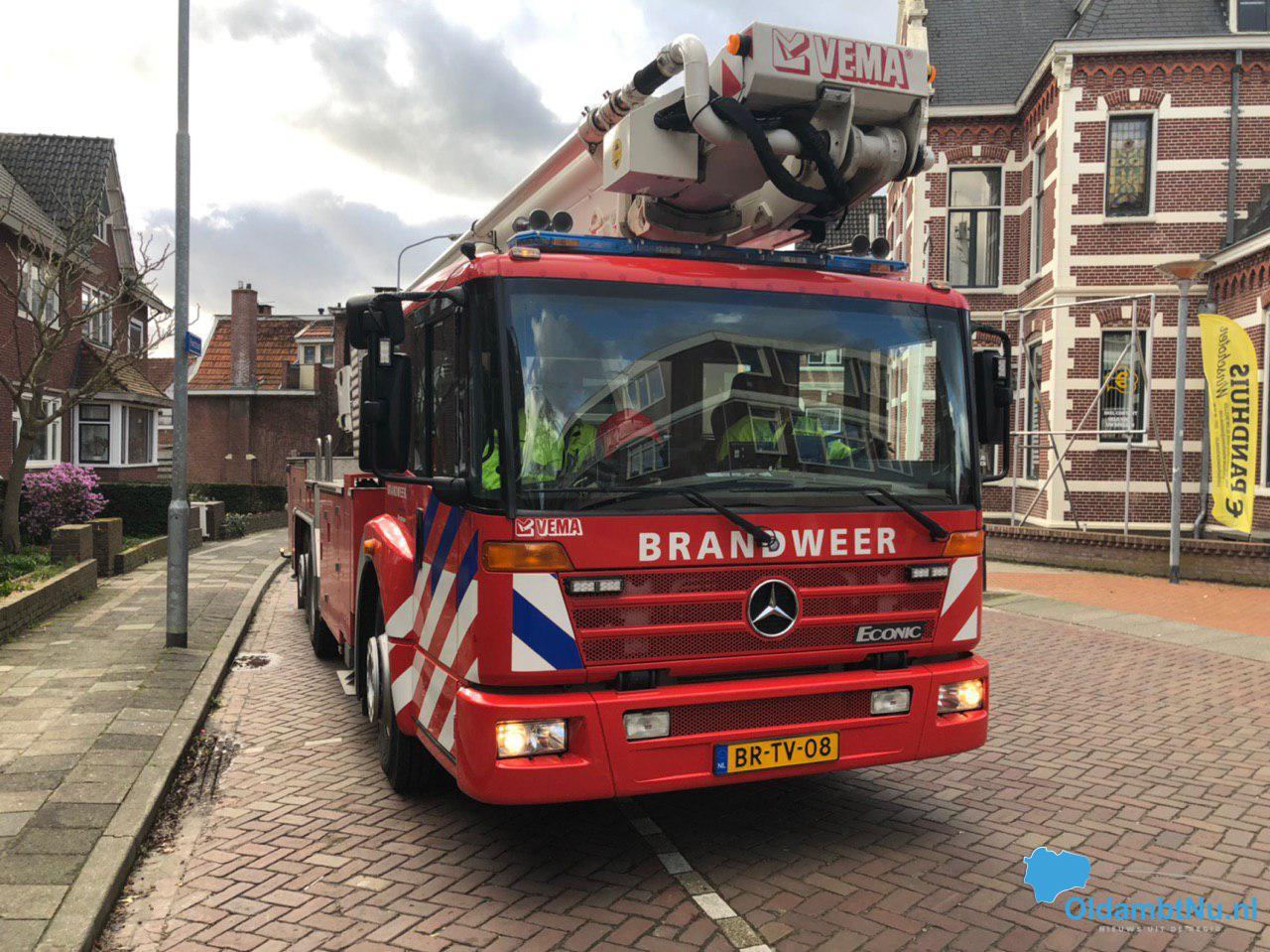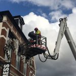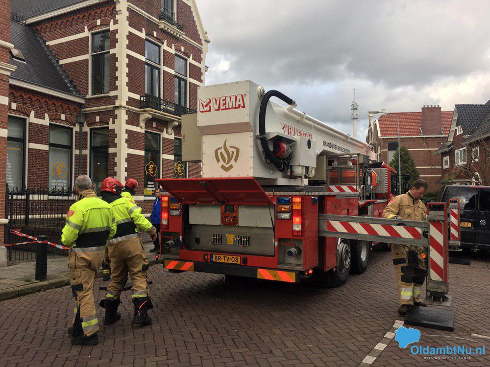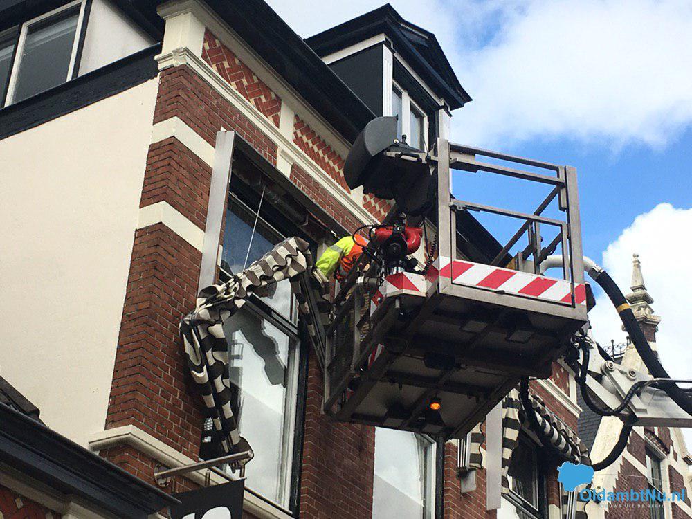 Met behulp van een hoogwerker werd de luifel – waar vol de wind op stond – verwijderd, waarna het gevaar geweken was.