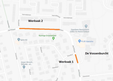De werkzaamheden worden uitgevoerd in twee werkvakken (zie onderstaand kaartje). De werkzaamheden starten in het eerste werkvak en nemen ongeveer twee werkdagen in beslag. Daarna start de aannemer in het tweede werkvak. Deze werkzaamheden duren ongeveer vier werkdagen. De aannemer verzoekt u om geen auto’s langs de weg te plaatsen op de plekken waar gewerkt wordt.