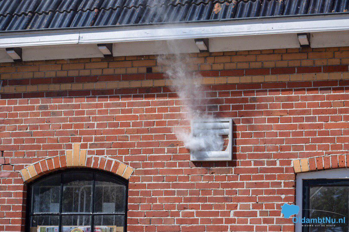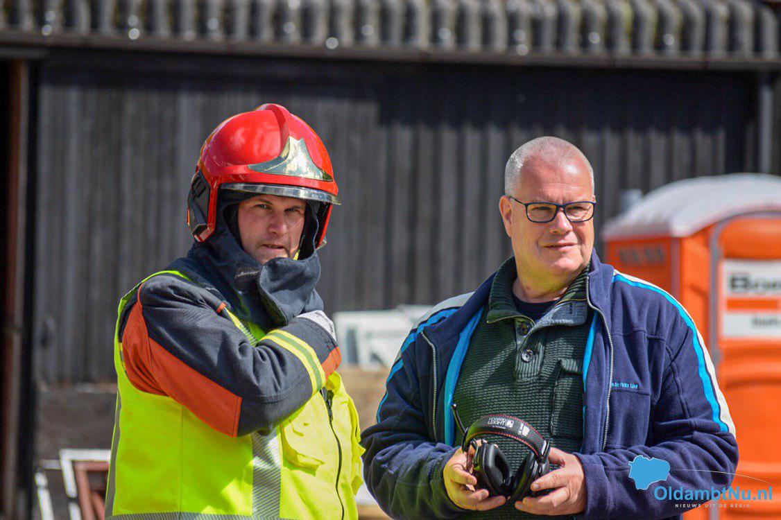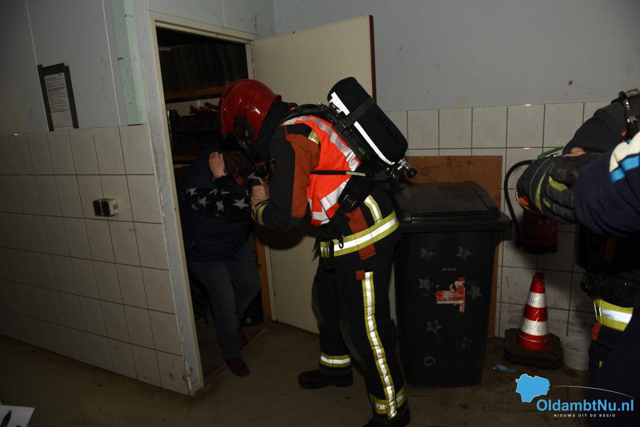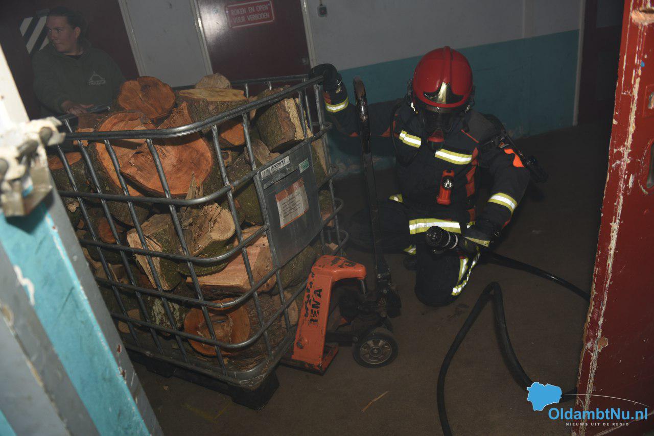 Bij aankomst van de brandweer vertelde één van de in paniek zijnde vrijwilligers dat er nog 2 of 3 van zijn vrienden in de houtkloverij en de werkplaats aan het werk zijn. Binnen woedt een kleine brand in een bult gekloofd hout die veroorzaakt is door een ontplofte accu van een accuboormachine.