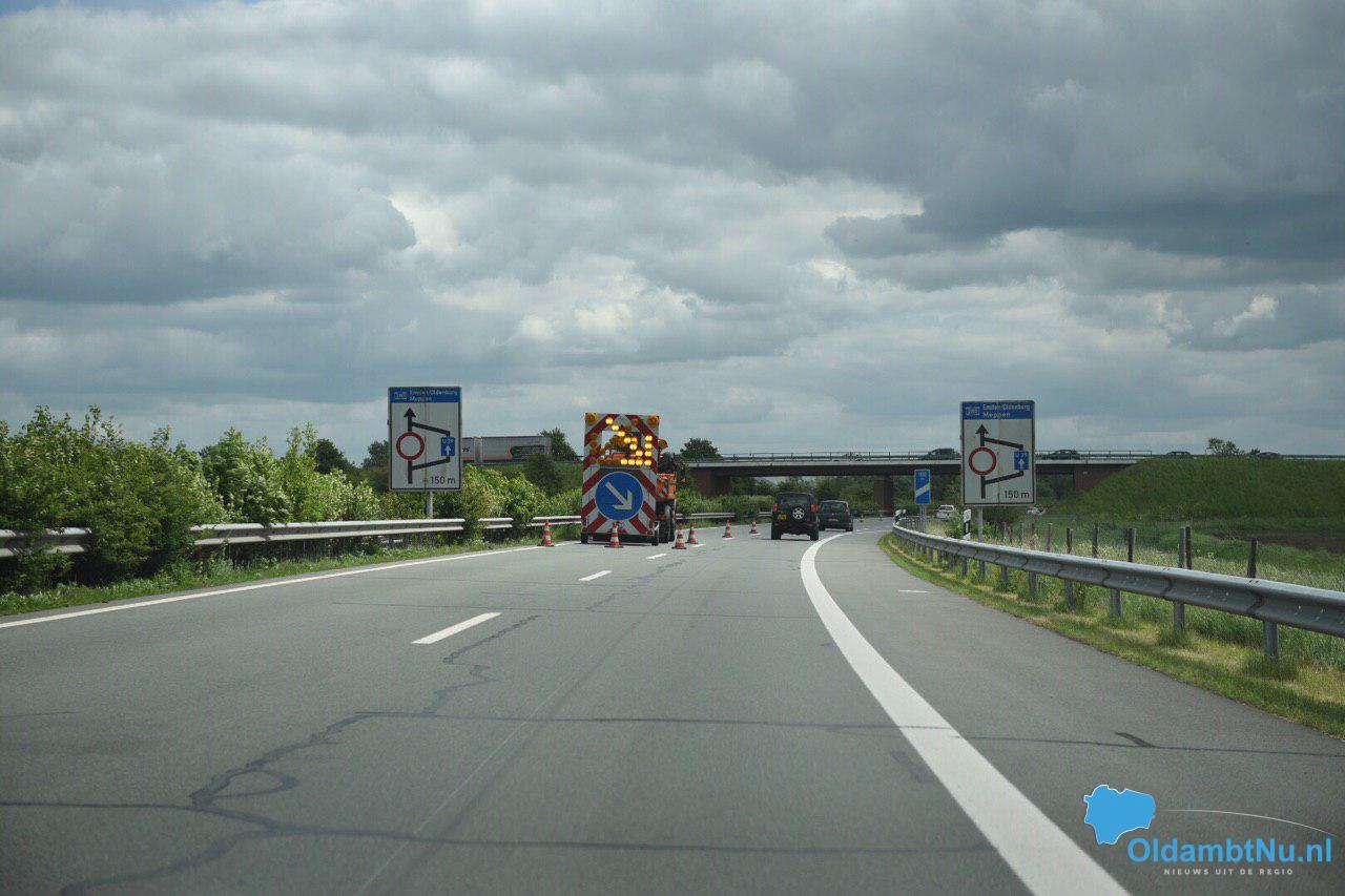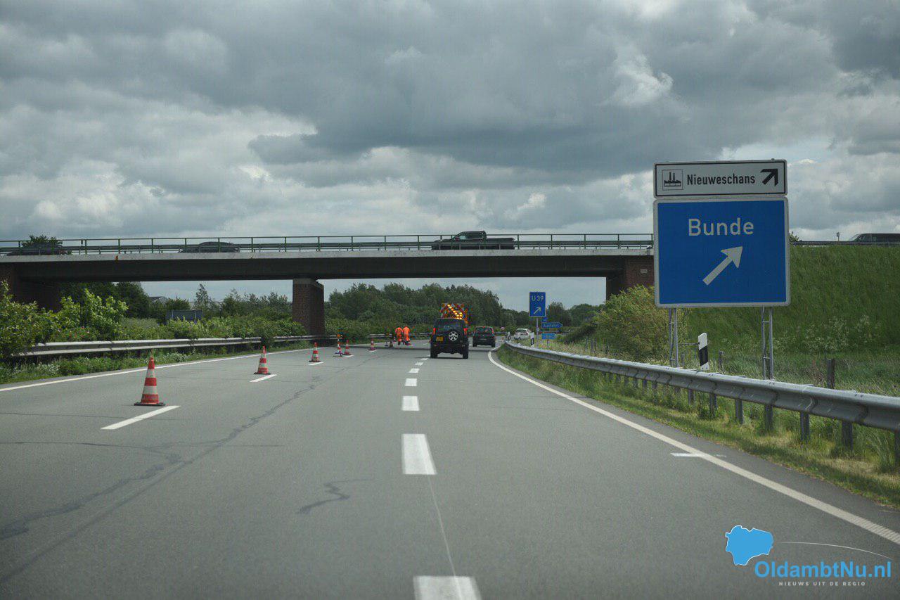 De snelweg is daardoor volledig afgesloten. Het is niet duidelijk hoe lang het bergen van de vrachtwagen en opruimen van de lading nog gaat duren. De omleiding gaat door Bunde.