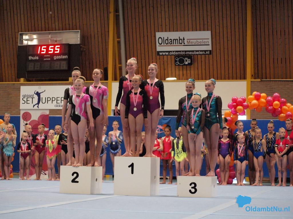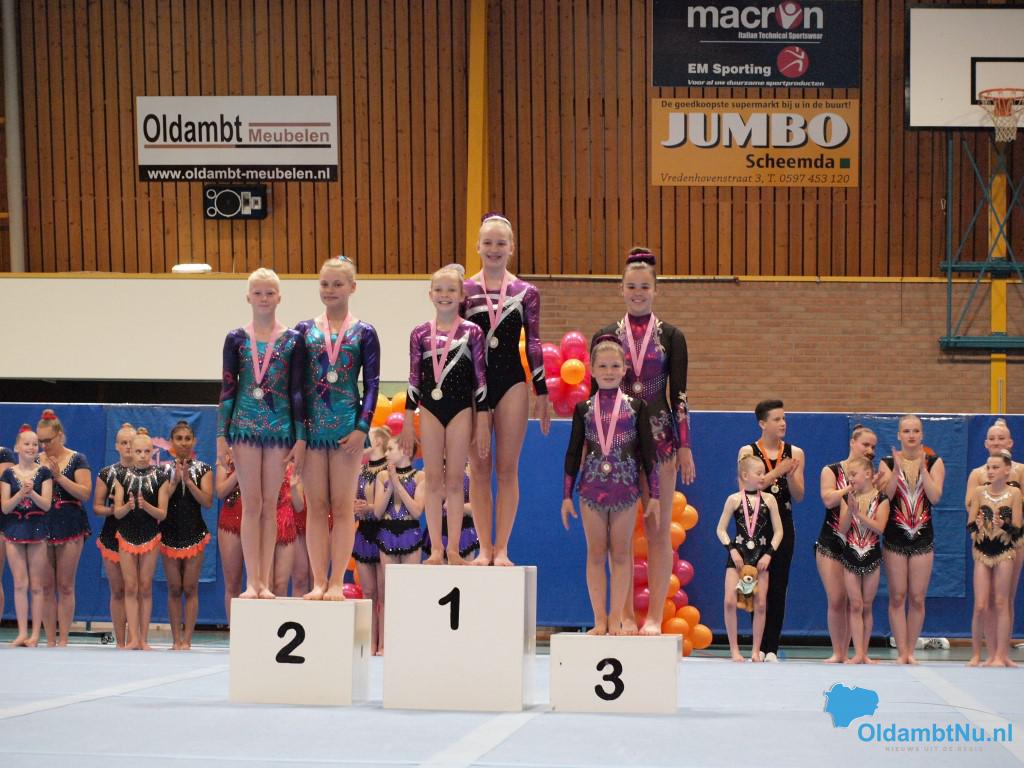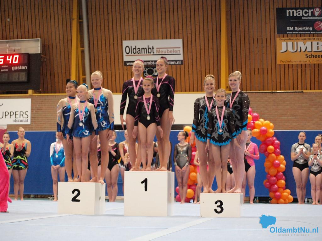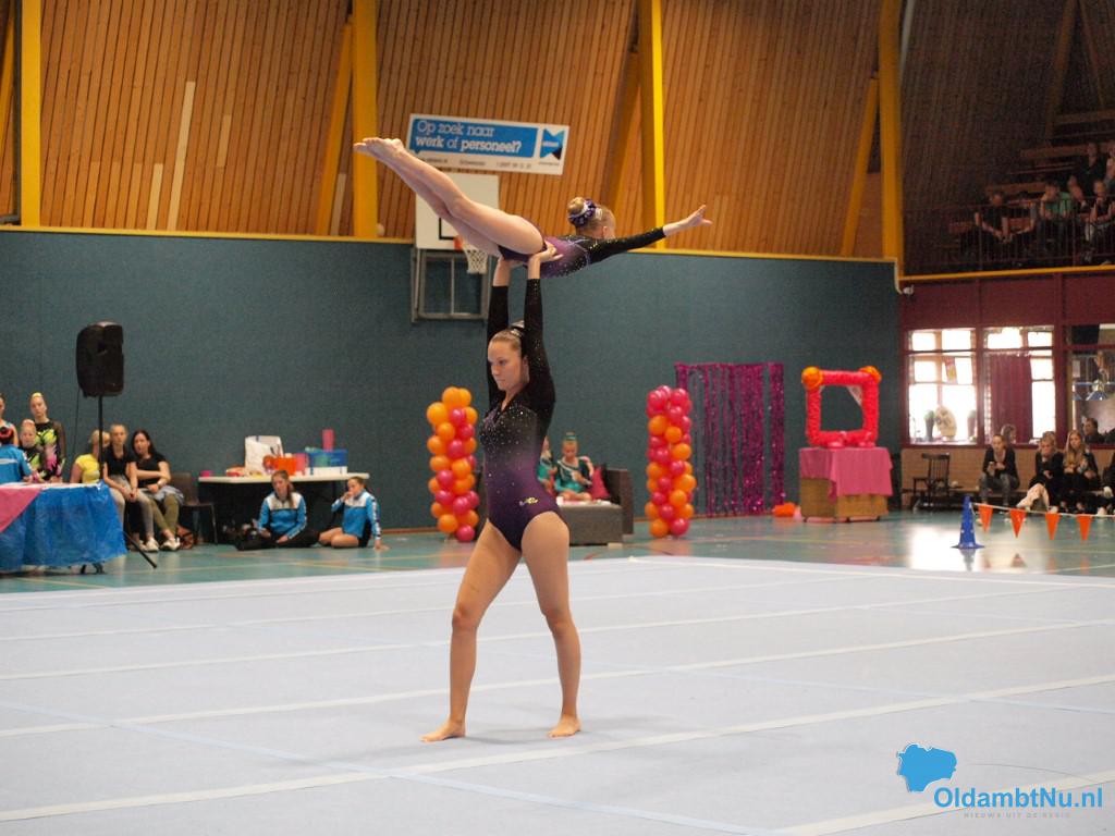 Op de zondag was het een lange dag met veel niveaus. Bij de duo’s D jeugd was er een eerste plaats voor Denise Hollander en Riva Werkman van Bato. Mirna van der Grind en Florianne Bakema van het Turninstituut behaalden het zilver en het brons ging naar Charlotte Hilverts en Mylene Horrel. Bij de senioren E-lijn werd het goud behaald door Myrthe Hilverts, Merle Smits en Laura Horrel.