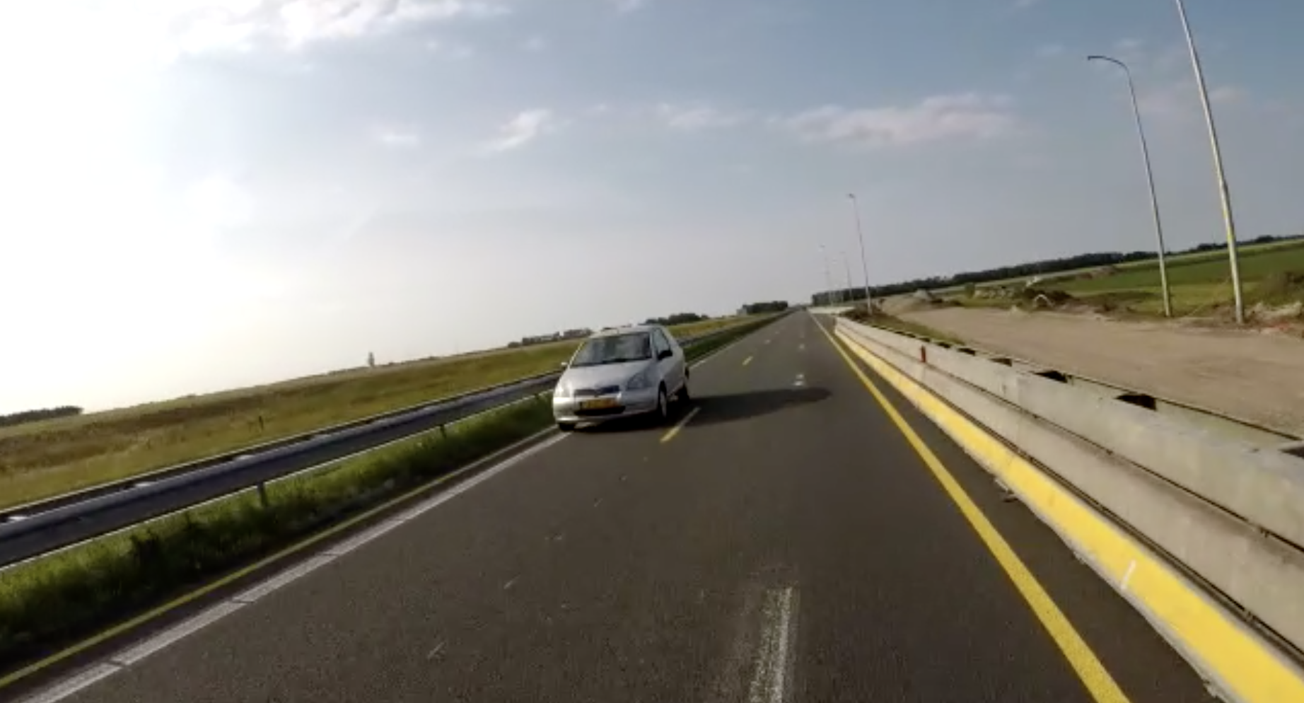 “Het leek of de bestuurster volkomen verward in de auto zat.” zegt Wouter. “Ik heb gebaren gemaakt, maar ze reed zonder op en aan te kijken door.” Het was de eerste keer dat Wouter met een camera op zijn helm reed. “Je maakt wat mee op de motor, maar dit had ik echt niet verwacht.”