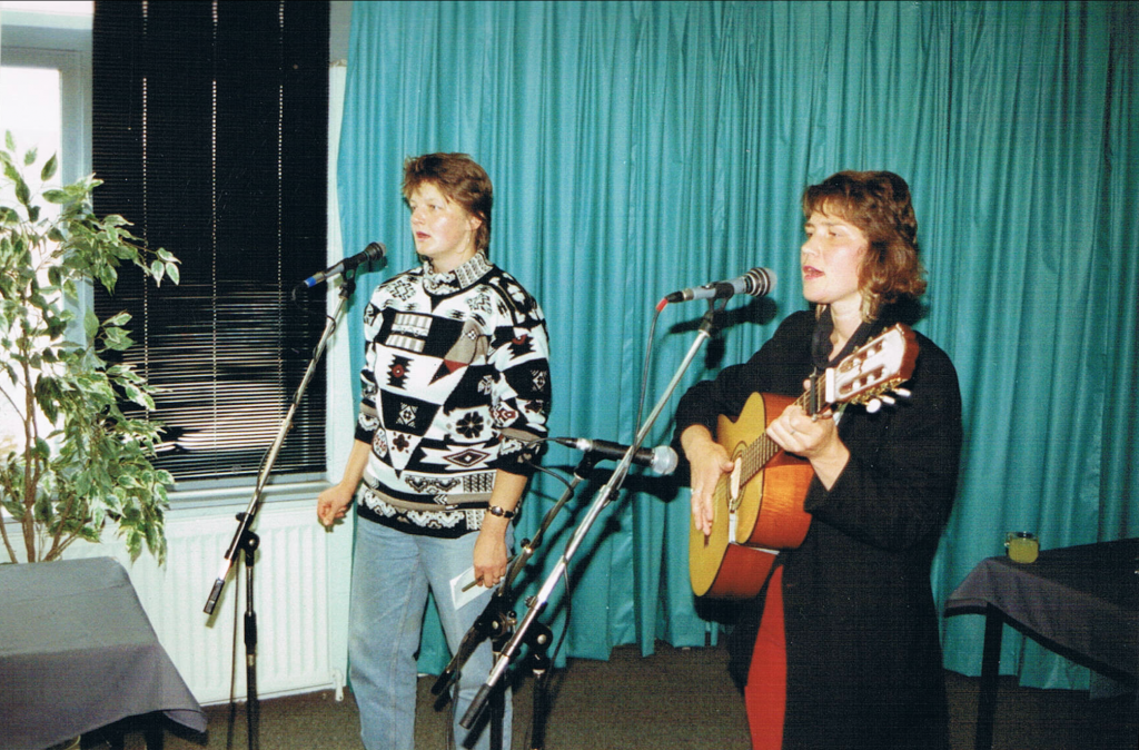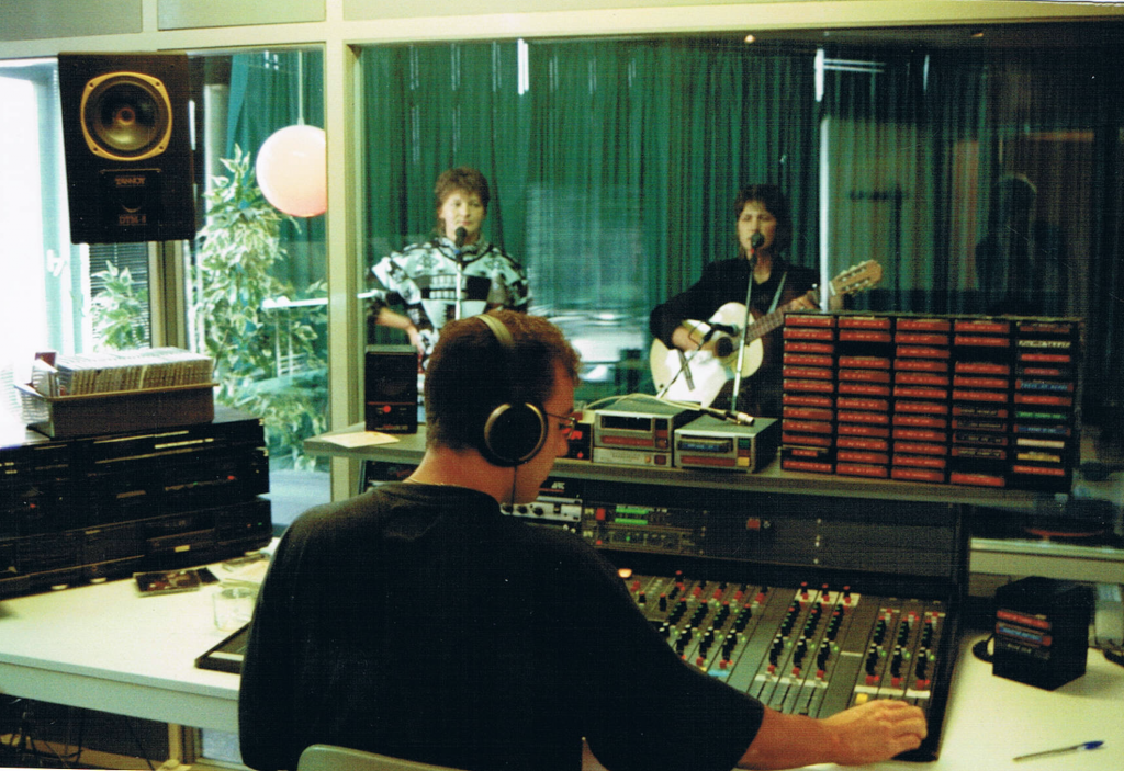 In 1994  toe de Run weer eens gezegend was met bijzonder fraai weer, troffen we op het plein een zangduo uit het Oostblok, die als fans naar Winschoten waren afgereisd. Hun zangkwaliteiten waren groots en na afloop van de Run dat jaar besloten we het duo –dat door het leven ging onder de artiestennaam Ayna en Solvita- uit te nodigen in ons programma Magazine, dat de zondag aansluitend aan de wedstrijd werd uitgezonden. Dat had nogal wat voeten in aarde, want er was ook hier duidelijk sprake van een taalbarrière. Maar uiteindelijk kwamen Ayna en Solvita op het gewenste tijdstip in de studio en zongen daar live de sterren van de hemel. Later bleek dat de dames in hun hun land een behoorlijke sterrenstatus hadden. Op de foto de dames die technisch op een voortreffelijke wijze werden geregistreerd door een van de eerste technici binnen Radio Winschoten Okko Veen.