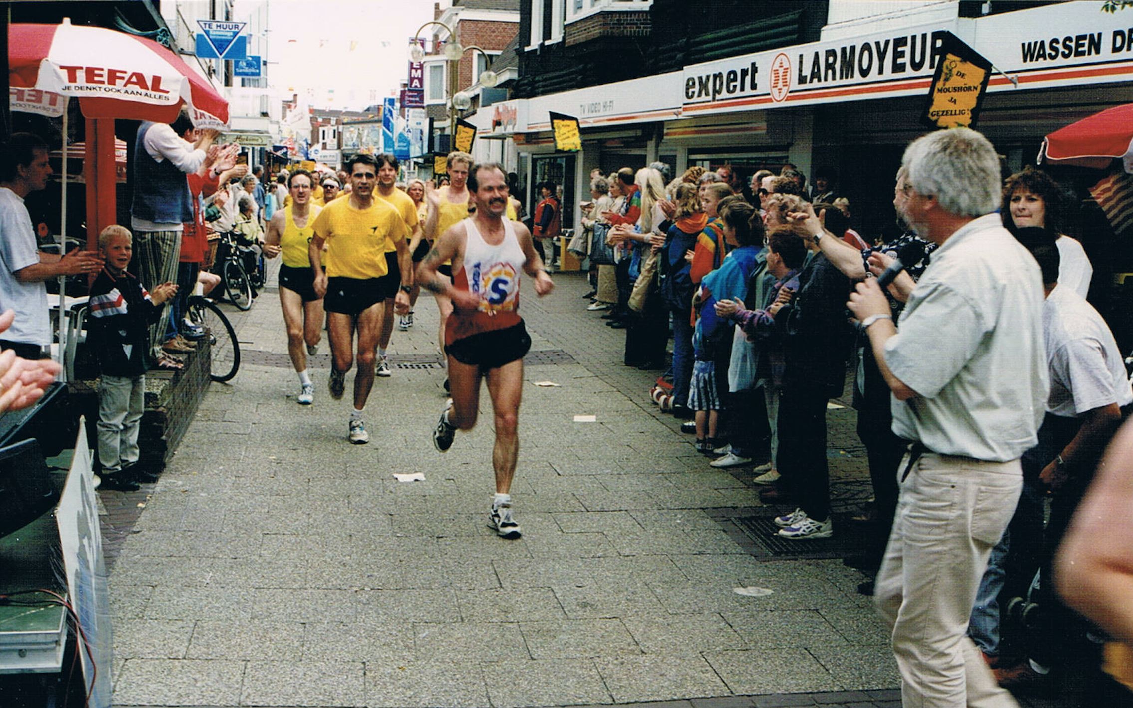 “Lijdend” voorwerp was elke keer Winschoter Henk Noor, die zich steeds weer liet lenen voor een bijzondere hardloopprestatie. Op de foto een binnenkomst van Henk in de Langestraat, waarbij duidelijk werd dat de publieke belangstelling elk jaar groot was.