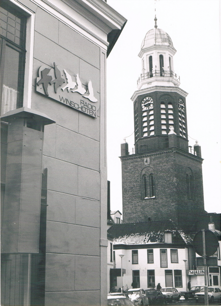 Nadat we een deel van de krantenknipsel en de foto’s hadden bekeken, stuitten we op zijn grootste klus bij de omroep . Via medeoprichter Gerrie de Vrieze werden we namelijk in staat gesteld een ruimte te gebruiken boven de toenmalige cafetaria Het Carillon op het Marktplein in Winschoten. Inderdaad in het kloppend hart van Winschoten met een uniek uitzicht uit de “Ollie Witte”.