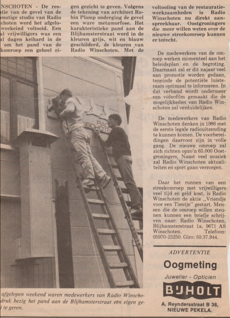 We tonen een foto van de geverfde gevel met daarop het Radio Winschoten logo en het genoemde uitzicht op de Winschoter toren. Om het verhaal compleet te maken ook nog een foto van het pand in de oude staat, met daarop eigenaar Gerrie de Vrieze en medeoprichter en oud collega van Henk, Wiebe Klijnstra.