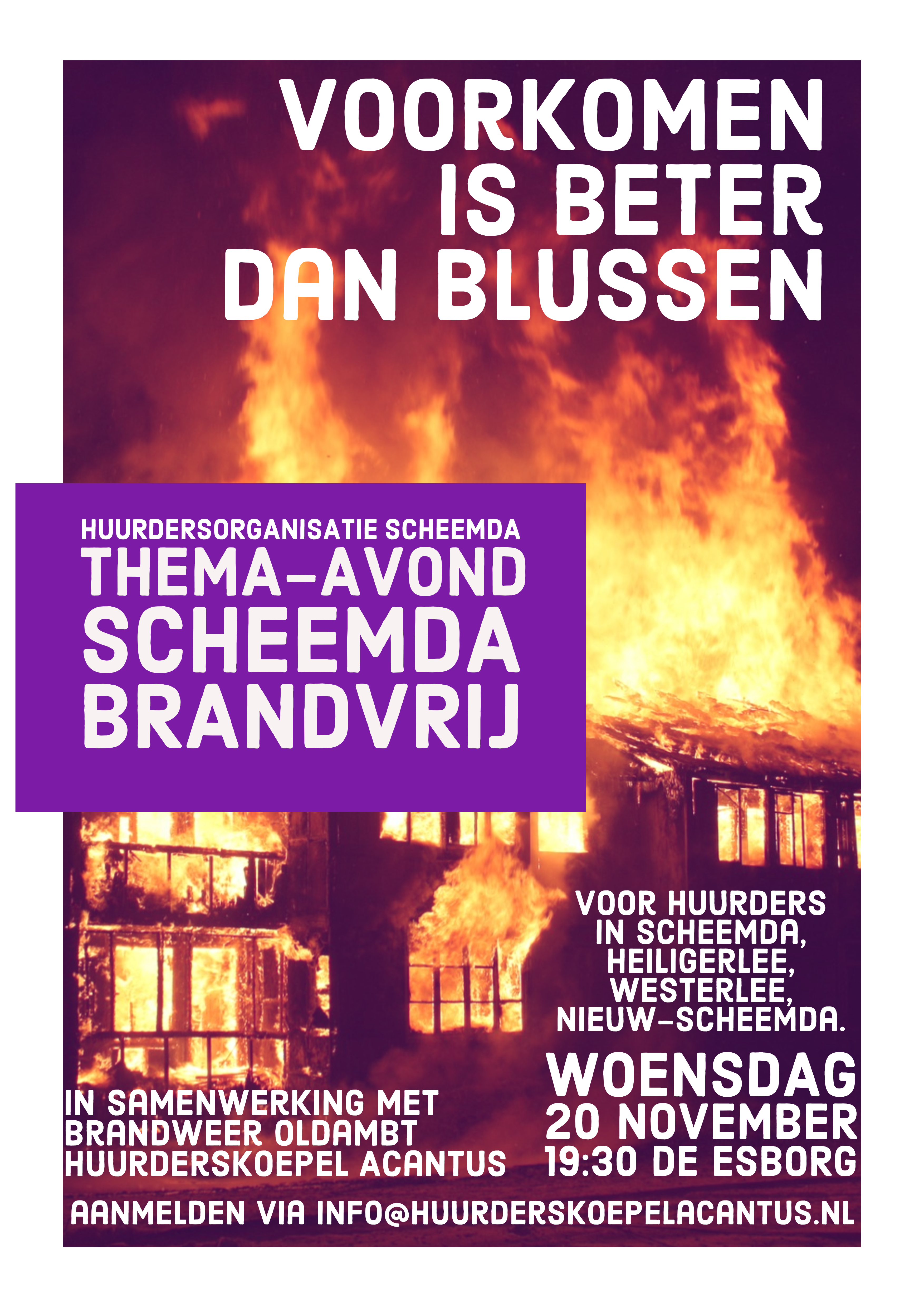 Scheemda – Op woensdag 20 november organiseert de Huurdersorganisatie Scheemda in samenwerking met de Brandweer Oldambt en Huurderskoepel Acantus een thema-avond over de brandveiligheid van woningen.