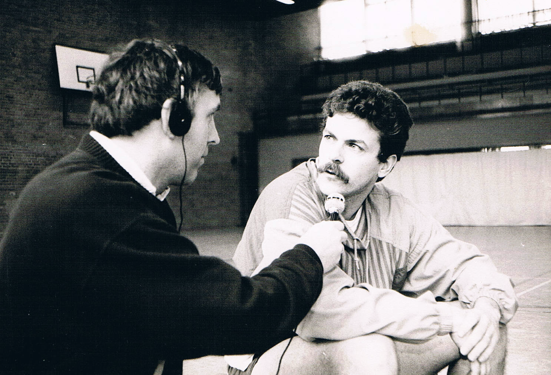 Op de zwart-wit foto Gertjan Russchen voetbalverslaggever, maar ook vooral de “stem” van het sportprogramma. Hij sprak met zijn fantastische radiostem vrijwel alle jingles in. Naast hem een van de anderen voetbalverslaggevers Fokko Pettinga.