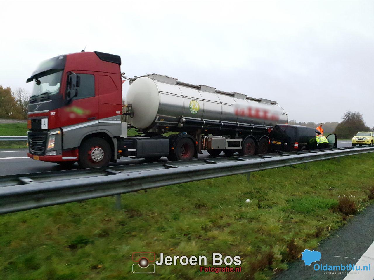 De auto kwam door de botsing vast te zitten tussen de vrachtwagen en de vangrail. Er raakte voor zover bekend niemand gewond.