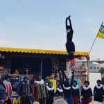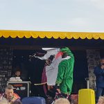Hier staat een podium klaar waar een vertegenwoordiger van Handel & Nijverheid en wethouder Bard Boon Sinterklaas welkom heten. Maar er is nog een probleem! Ze hebben hun koffers mee genomen omdat ze vannacht in Scheemda zouden blijven slapen, maar ze weten niet meer waar. Alle koffers moeten worden uitgepakt om de kaart te zoeken. Gelukkig vinden ze de kaart en dansen ze van vreugde de polonaise. Zelfs Sinterklaas doet mee!