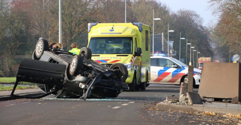 De automobilist botste op een paaltje en sloeg daarna over de kop. Een ambulance en de politie kwamen met spoed ter plaatse.