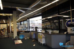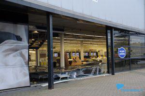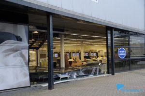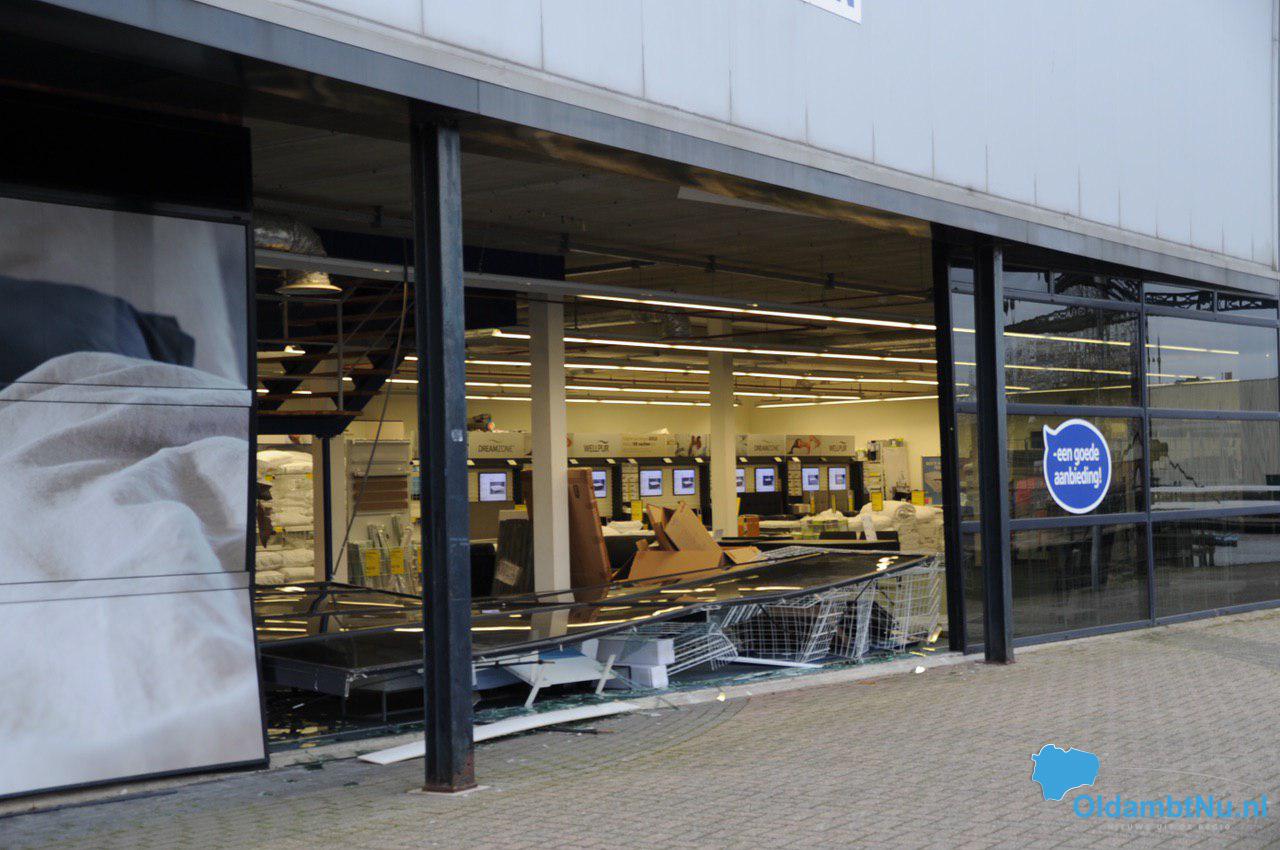 Winschoten – Door de storm is een deel van de glazen gevel van de Jysk in Winschoten ingestort. De raampartij is naar binnen gevallen.