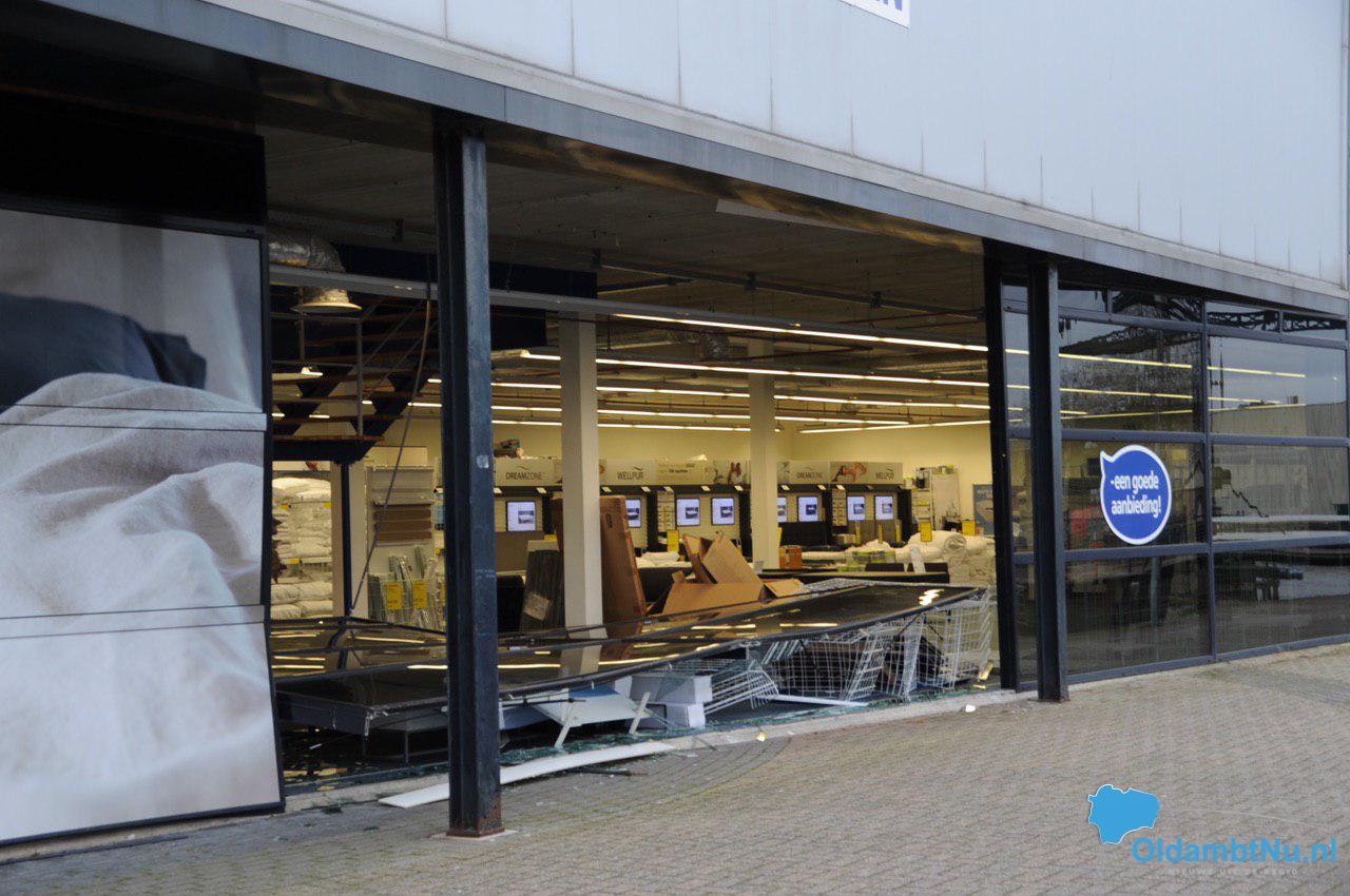 De Jysk was gewoon open toen het gebeurde. Een medewerker zag het raam bewegen en kon zich net op tijd uit de voeten maken.