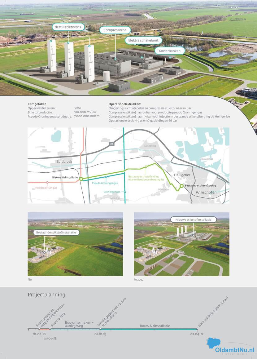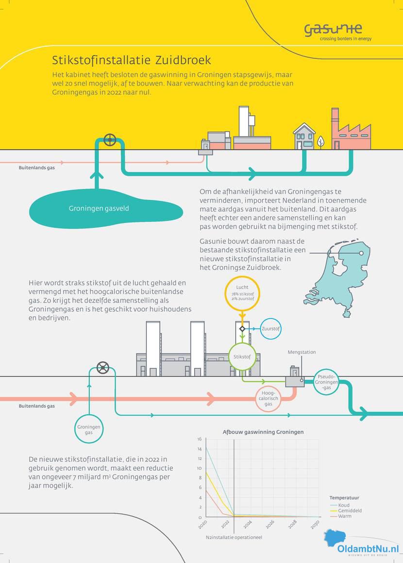 Regio: Zuidbroek – Maandag gaf minister Eric Wiebes van Economische Zaken en Klimaat het startsein voor de bouw van een mengstation voor aardgas in Zuidbroek. In deze installatie wordt stikstof uit de lucht gewonnen en gemengd met hoogcalorisch gas. Zo ontstaat laagcalorisch gas wat wél bruikbaar is voor Nederlandse consumenten en bedrijven. Dit is één van de maatregelen die ervoor zorgt dat het Groningenveld al in 2022 kan sluiten. Zuidbroek levert vanaf 2022 jaarlijks 7 miljard kubieke meter bruikbaar aardgas op.