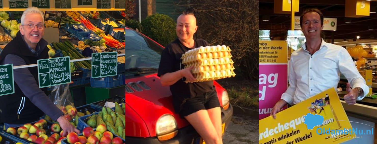Ook andere lokale ondernemers zijn inmiddels ingeschakeld bij de actie. Bij hen worden de ingrediënten ingekocht voor het ambachtelijk bereiden van de pofferts. Zo komen de appels bij Doddema Groenten & Fruit in Winschoten vandaan (foto links), de eieren bij de scharrelei-boerderij van Marianne Hoogstraten in Scheemda (foto midden) en ook Jumbo Jan van der Weele in Winschoten steekt een handje toe (foto rechts).