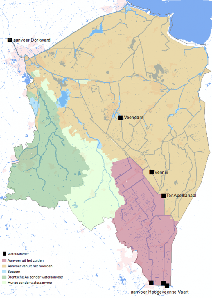 “Het oppervlaktewater dat wij aanvoeren komt vanuit het IJsselmeer. In onderstaande afbeelding ziet u waar in ons gebied we water kunnen aanvoeren en waar niet.” schrijft het Waterschap.