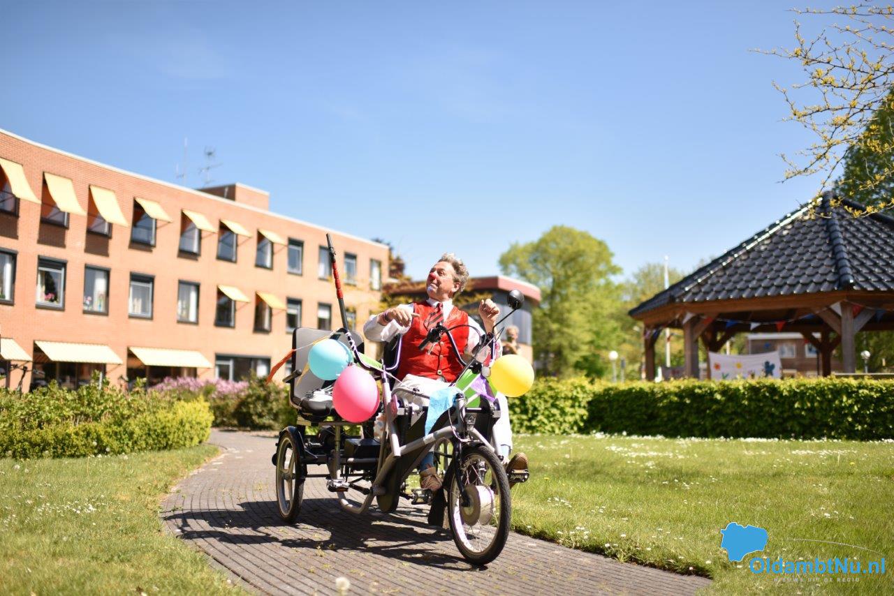 Beerta – Afgelopen donderdag kregen de bewoners van verpleegcentrum De Tjamme in Beerta bezoek voor het raam van clown Milo. De clown fietste op een versierde duo-fiets met muziek door de belevingstuin.