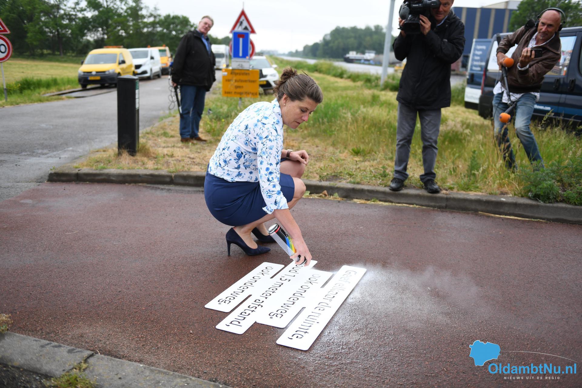 Donderdagochtend spoot Fleur Gräper-Koolwijk (gedeputeerde provincie Groningen) de eerste tekstsjabloon ‘Houd 1,5 meter afstand, ook onderweg’ op het asfalt bij de Waterhuizerbrug in Groningen. Op smalle fietspaden, op kruispunten, bij stoplichten of bruggen, kan het druk zijn en is 1,5 meter afstand houden soms lastiger. Op drukke plekken waar veel fietsers, scooters, brommers of voetgangers bij elkaar komen is het extra opletten. Ook hier geldt: geef elkaar de ruimte, ook onderweg.