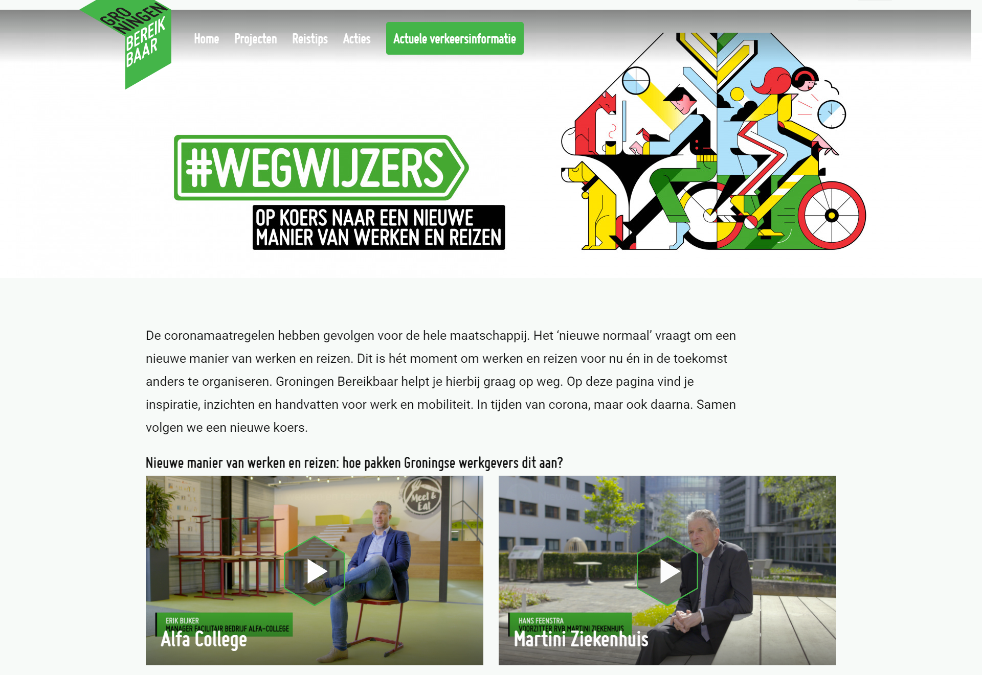 Om het bedrijfsleven en andere organisaties te helpen om te gaan met het ‘nieuwe normaal’, komt Groningen Bereikbaar op het platform met voorbeelden en andere inspiratie voor werk en mobiliteit. Ook vinden de werkgevers er concrete handvatten waarmee ze direct aan de slag kunnen. Het Martini Ziekenhuis en Alfa-college bijten het spits af en geven in een filmpje op het platform aan hoe ze omgaan met de veranderende mobiliteit en het thuiswerken.