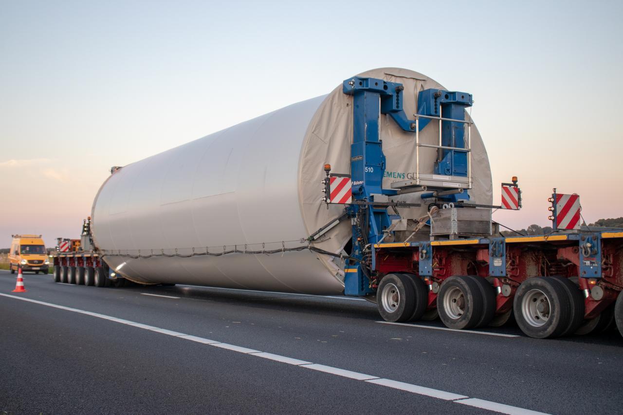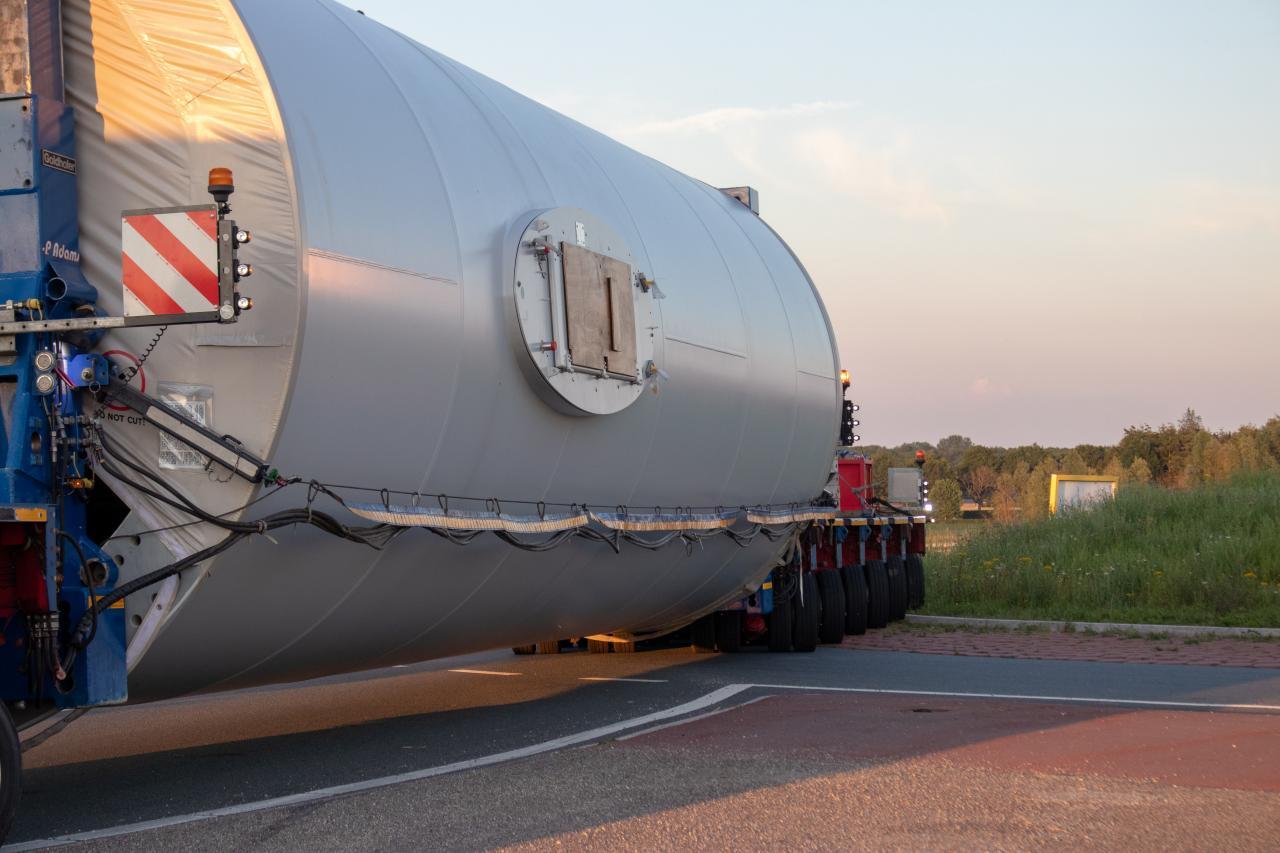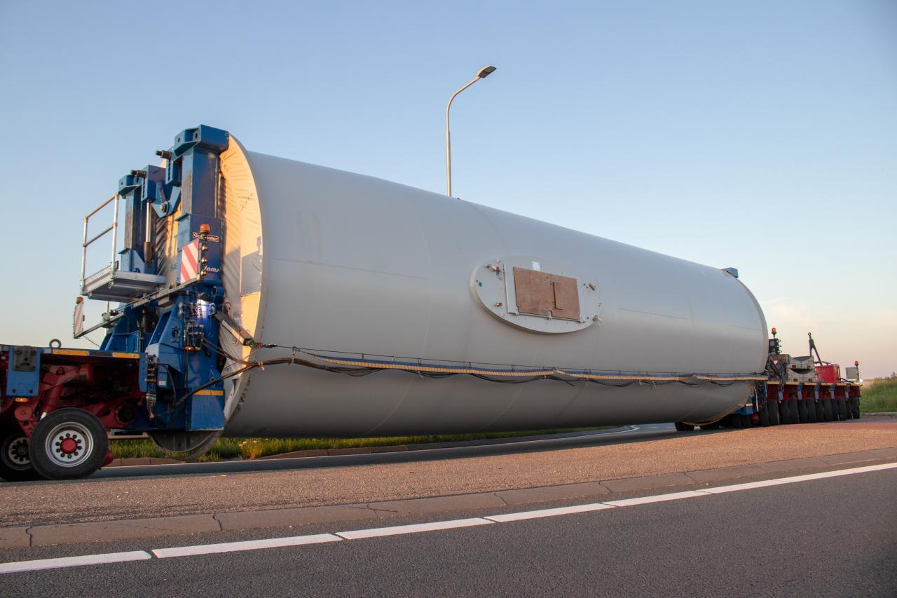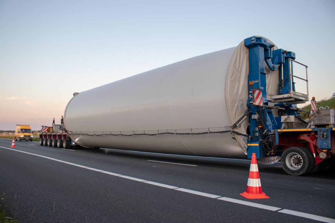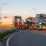 Eemshaven/ Scheemda/ Zuidbroek – Afgelopen dinsdag- en donderdagavond zijn de eerste transporten voor het Windpark N33 per vrachtauto vanaf de Eemshaven naar de locatie gebracht aan de N33 en de A7 nabij Zuidbroek. De mastdelen worden in meerdere etappes vervoerd naar hun eindbestemming. De funderingen van het project zijn al een tijd klaar.
