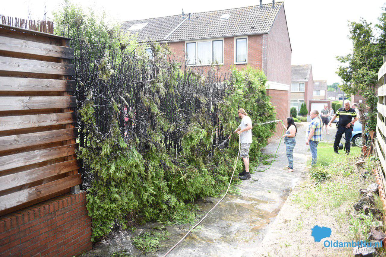 In afwachting van de brandweer waren de buren al bezig met tuinslangen om de brand te blussen. De brandweer heeft daarna de bluswerkzaamheden overgenomen. De coniferen liepen grote schade op door de brand.