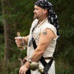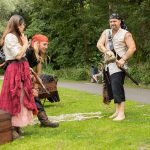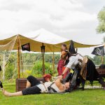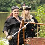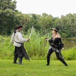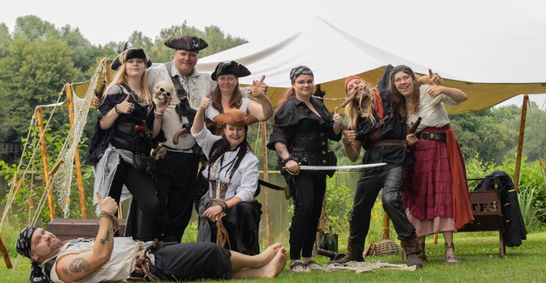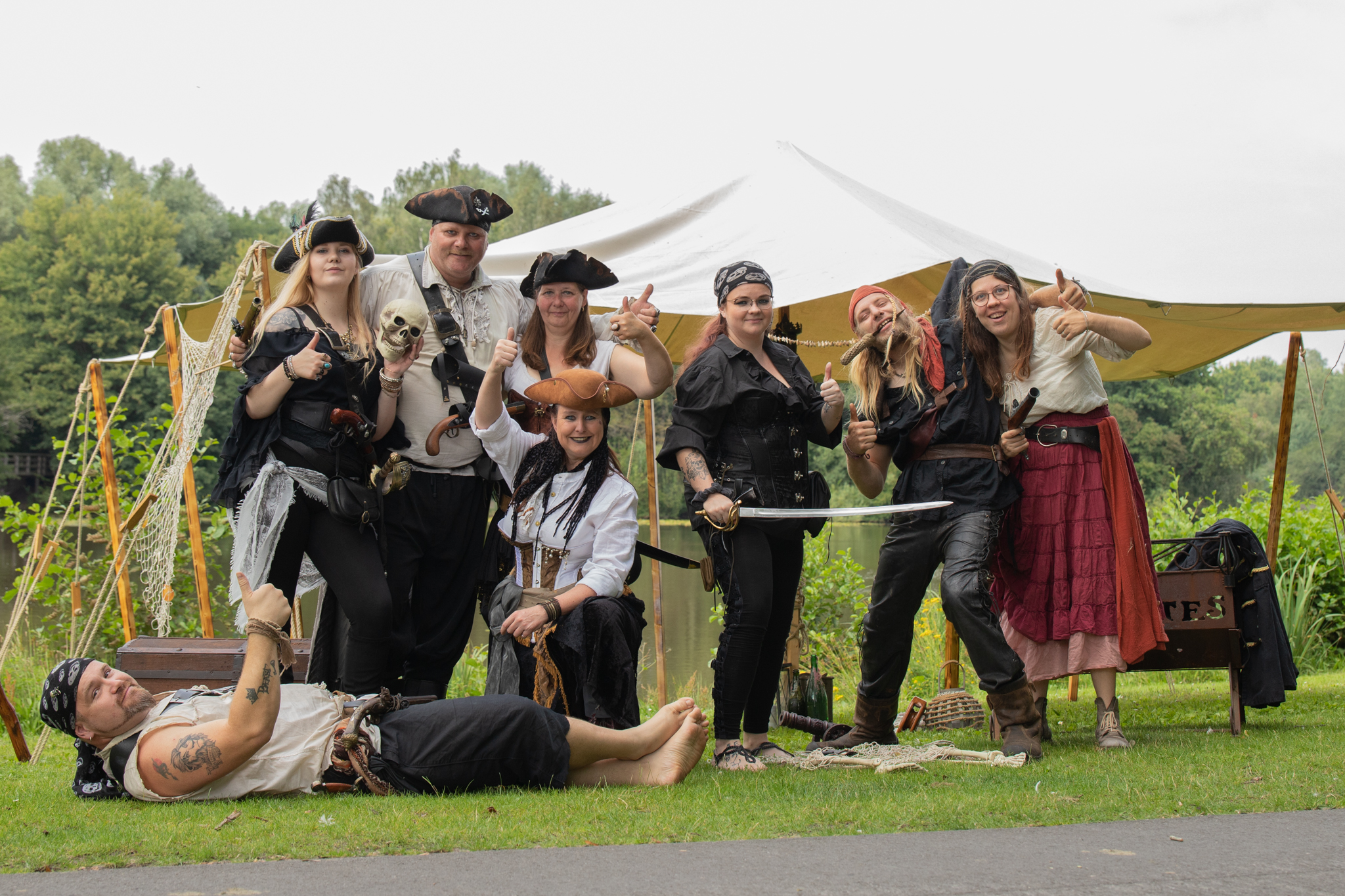 Reuring in het Stadspark te Winschoten…aan de waterkant hebben De Pirates hun kamp opgeslagen, Capt’n Morgen en Anne Bonny gaan elkaar met zwaarden te lijf terwijl aan de andere kant twee piraten vechten om een fles rum.