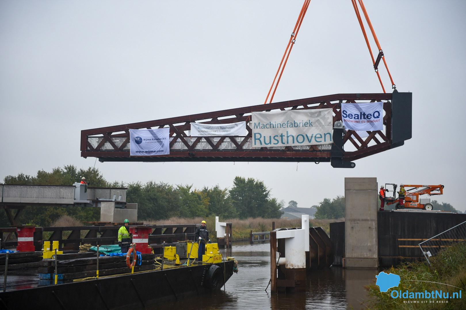 Twee hijskranen tilden het 23 meter lange en 86 ton wegende brugdeel woensdagochtend op zijn plek. Het Winschoterdiep werd afgesloten voor de scheepvaart.
