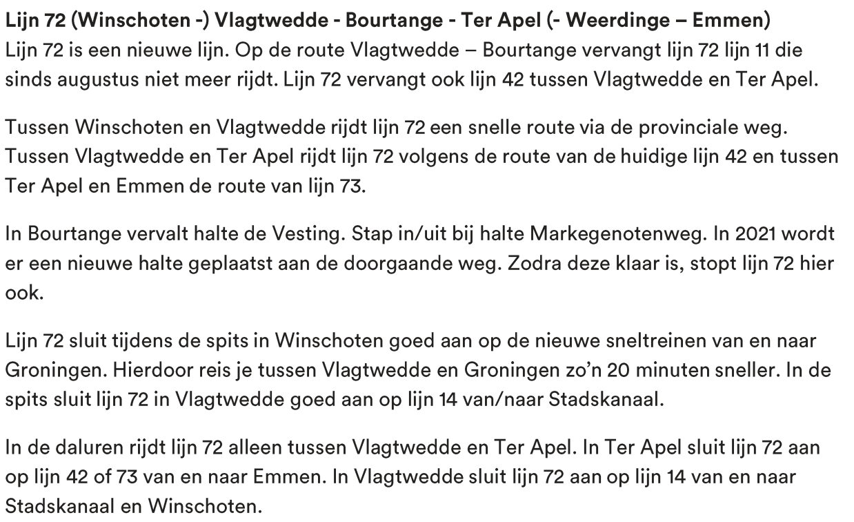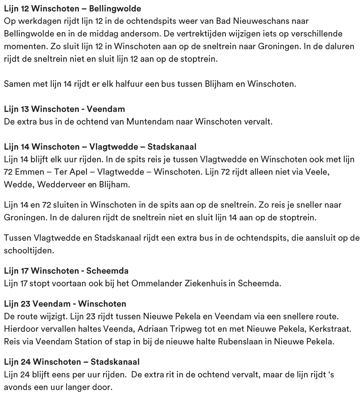 Op veel andere verbindingen worden ook wijzigingen doorgevoerd, zoals de introductie van de nieuwe lijn 72 Emmen – Ter Apel – Bourtange – Vlagtwedde – Winschoten, die delen van de lijnen 14, 42 en 73 vervangt. Lijn 109 Assen – Zernike zal weer gaan rijden en zal in Assen gaan doorrijden via de Europaweg naar het station.