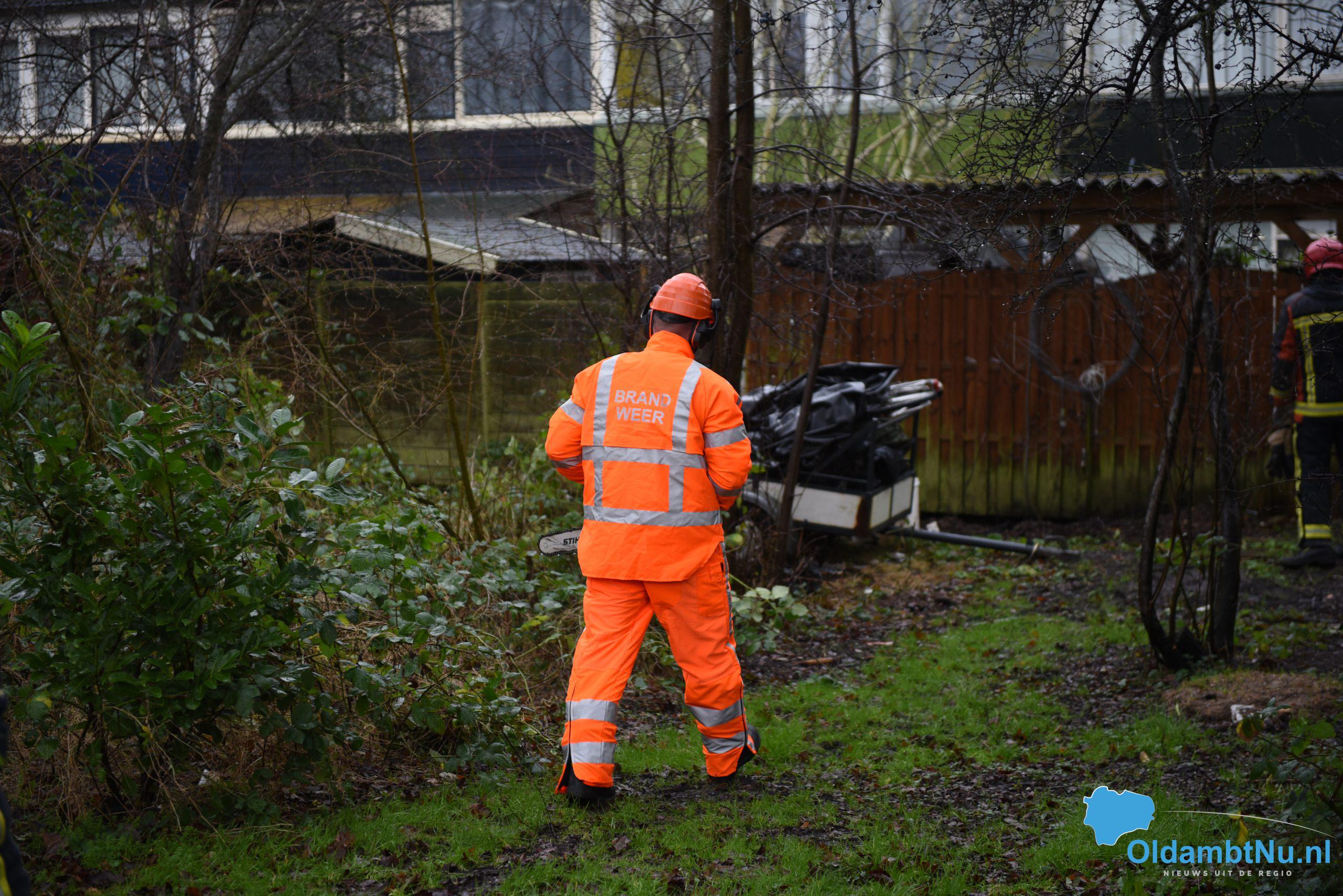 Brandweerlieden hebben met een kettingzaag de boom een kopje kleiner gemaakt. Vervolgens is de boom uit de tuin gehaald.