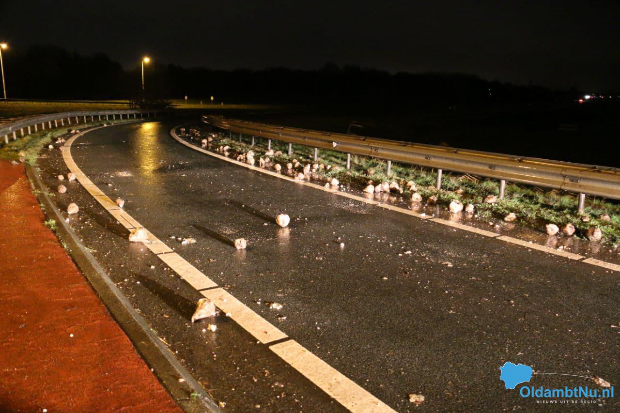 Rijkswaterstaat is vanochtend direct begonnen met opruimen. “Pas uw snelheid aan, zeker in de buurt van de opruimwerkzaamheden. De weg kan bovendien glad worden en bieten kunnen schade aan uw auto veroorzaken.” waarschuwt de politie.