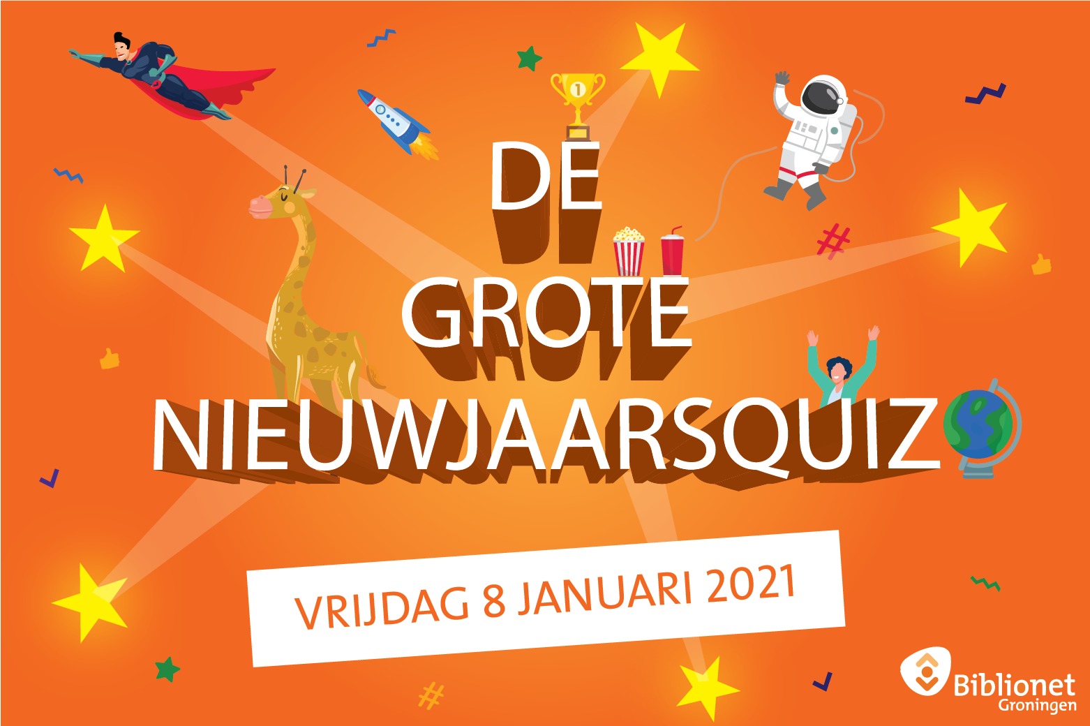 Op vrijdag 8 januari kun je met het hele gezin meedoen aan de Nieuwjaarsquiz van Biblionet Groningen. Van 18.30 tot 19.30 uur presenteert Ian de Kahoot-quiz live op onze Facebook-pagina. De vragen zijn een uitdagende mix voor alle leeftijden. Deelname is gratis én er is een mooie prijs te winnen.
