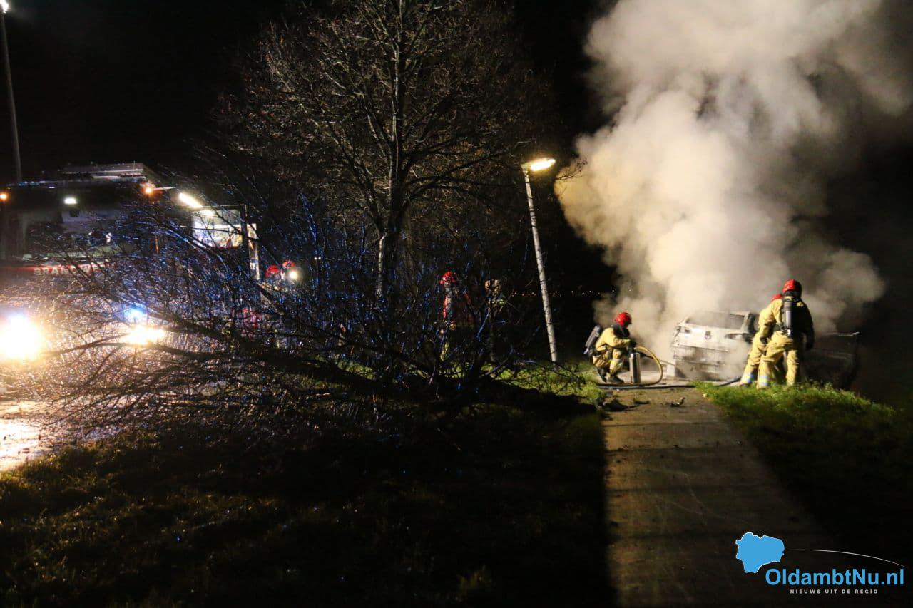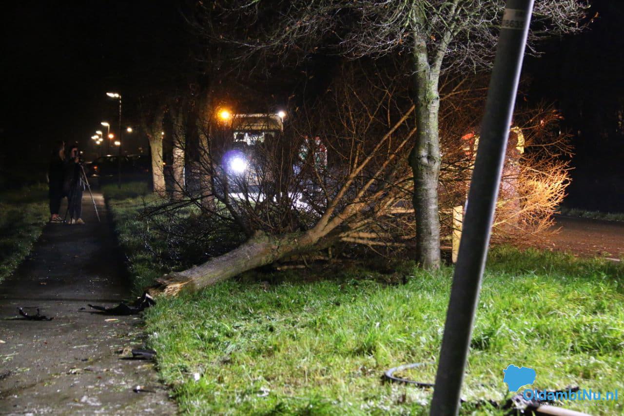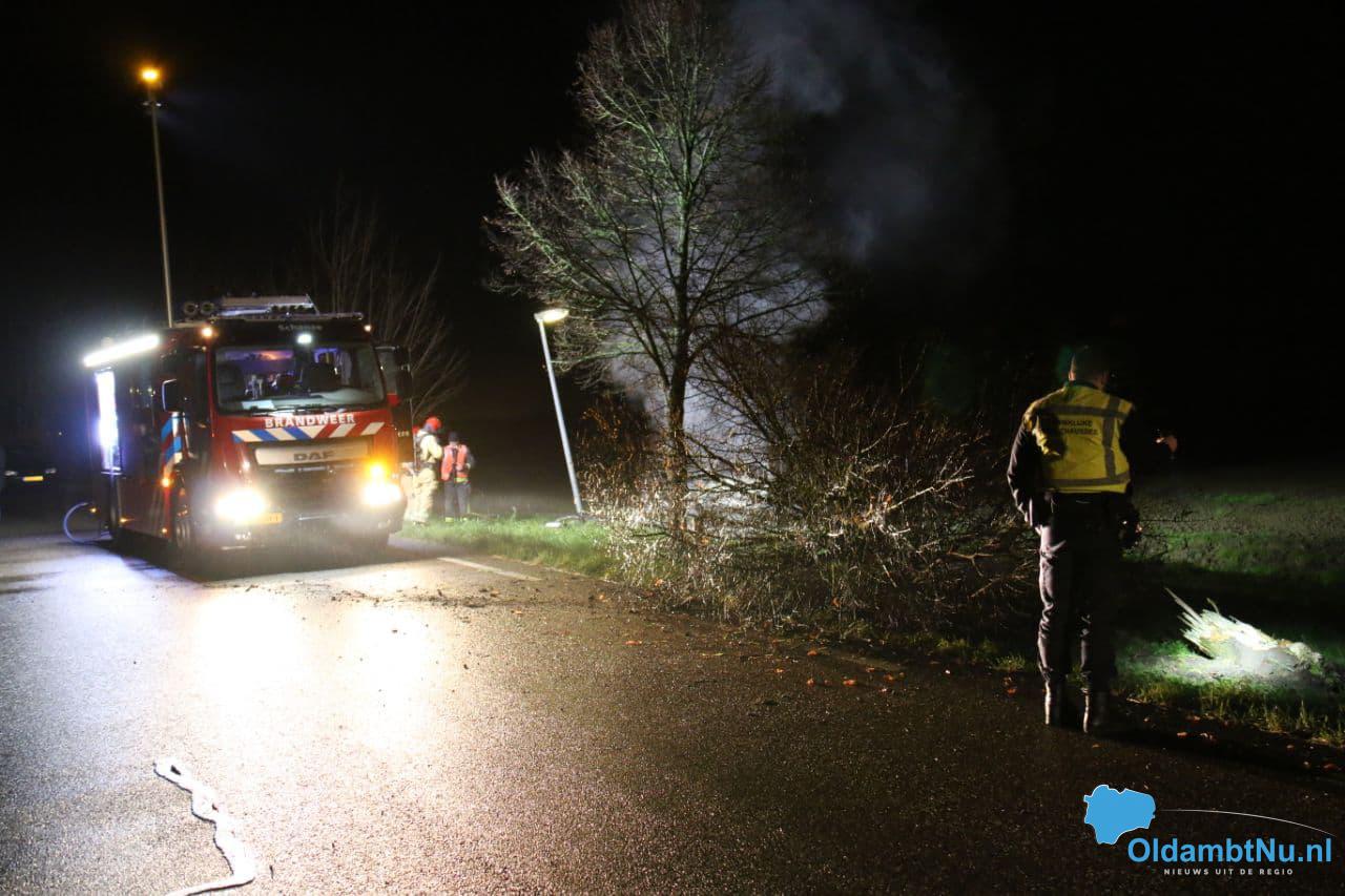 Auto raakt van de weg, rijdt door boom en raakt in brand