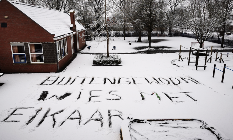 Het motto van de school brengt ons samen, deze stond van de week levensgroot op het schoolplein in de sneeuw geschreven. Al vroeg in de ochtend waren twee leerkrachten, die op school aanwezig waren voor de noodopvang, druk aan het vegen.