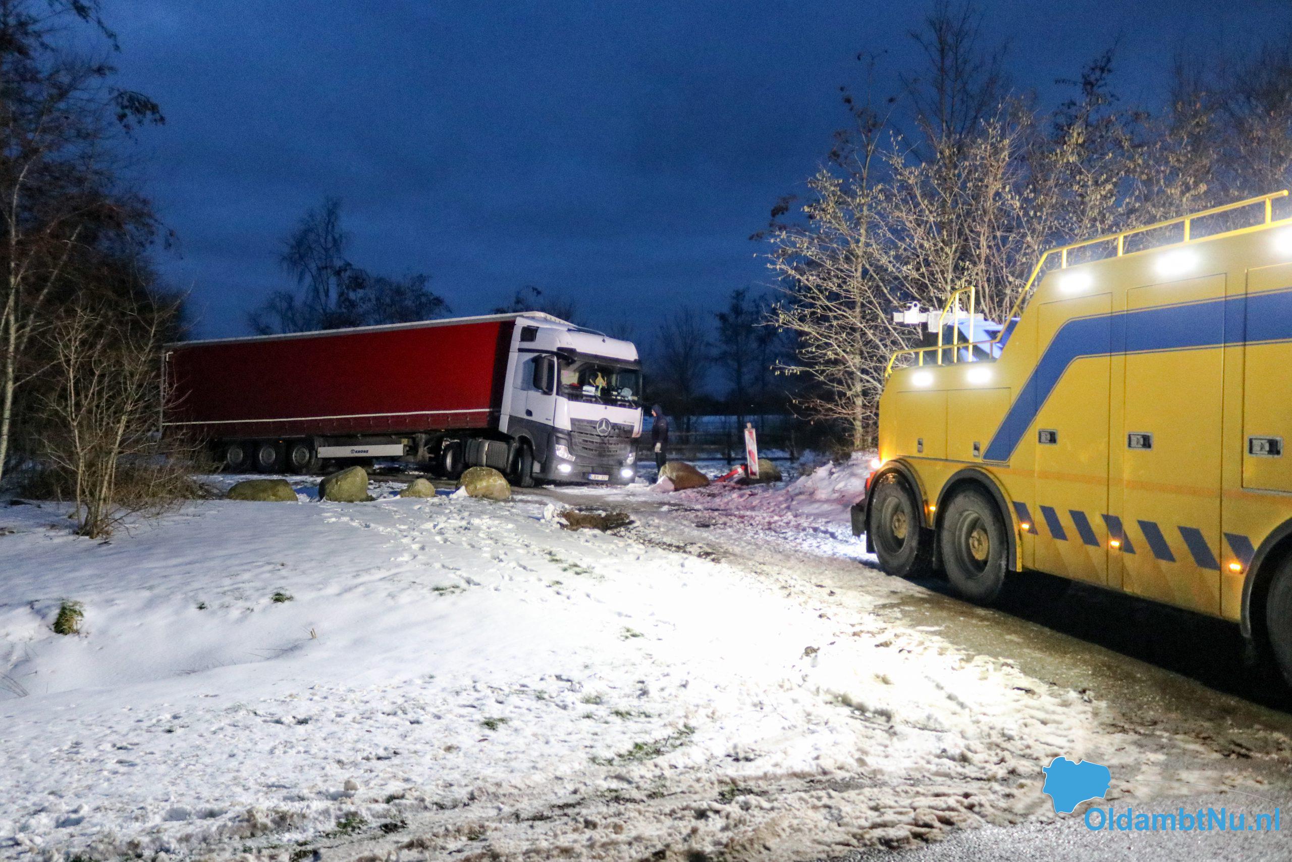 Naar verluidt was de chauffeur op weg naar een pallet bedrijf een dorp verderop in Finsterwolde en heeft hij de verkeerde afslag genomen. De chauffeur heeft in afwachting van de sleepdienst de 24 eenzame uren afgewacht in zijn truck.