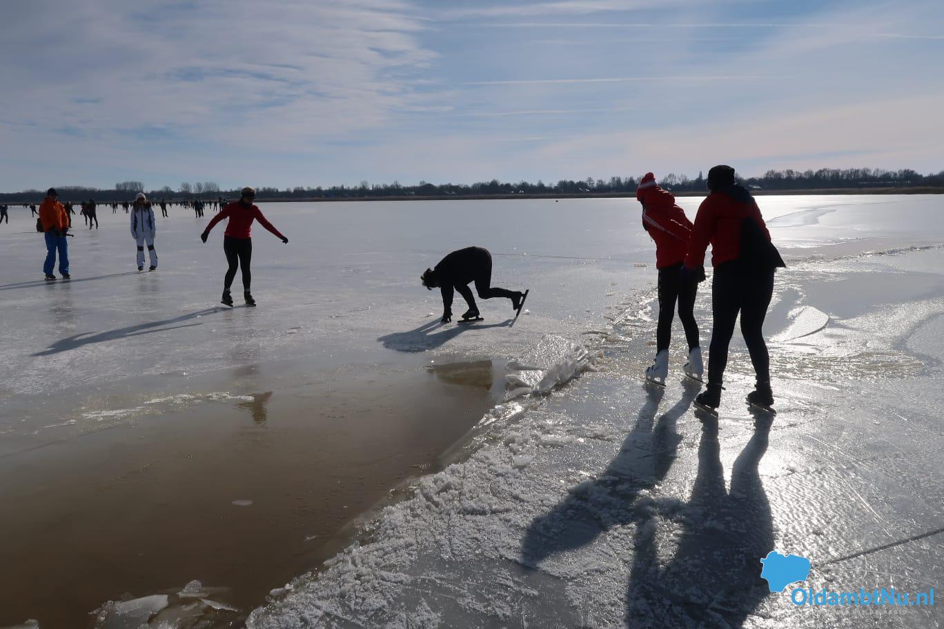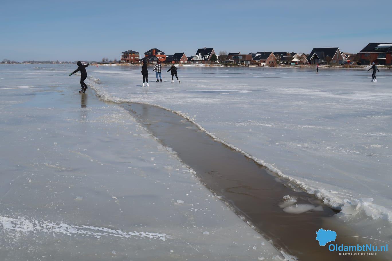 Echter, de kwaliteit van de ijsvloer op het Oldambtmeer wordt snel minder, Mensen vallen massaal en krijgen natte voeten. Zowel aan de kant van Finsterwolde als het Havenkwartier wordt het nu gevaarlijk.