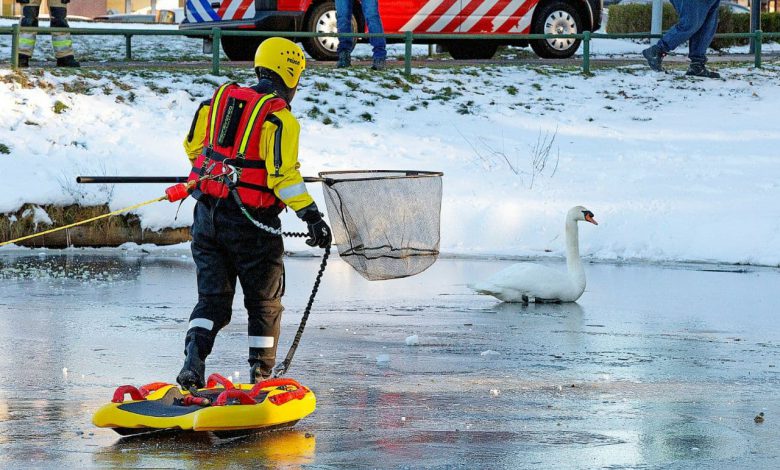Vrijdagochtend werden ze opgeroepen voor een dier in problemen aan de J.G. Pinksterstraat in Veendam. Hier bleek een zwaan vast te zitten op het ijs. De brandweer heeft de zwaan los weten te krijgen.