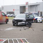 De bestuurder van een Audi kwam door een nog onbekende oorzaak in botsing met een auto met aanhanger. Op de aanhanger lag een steiger, deze viel door de botsing van de aanhanger.