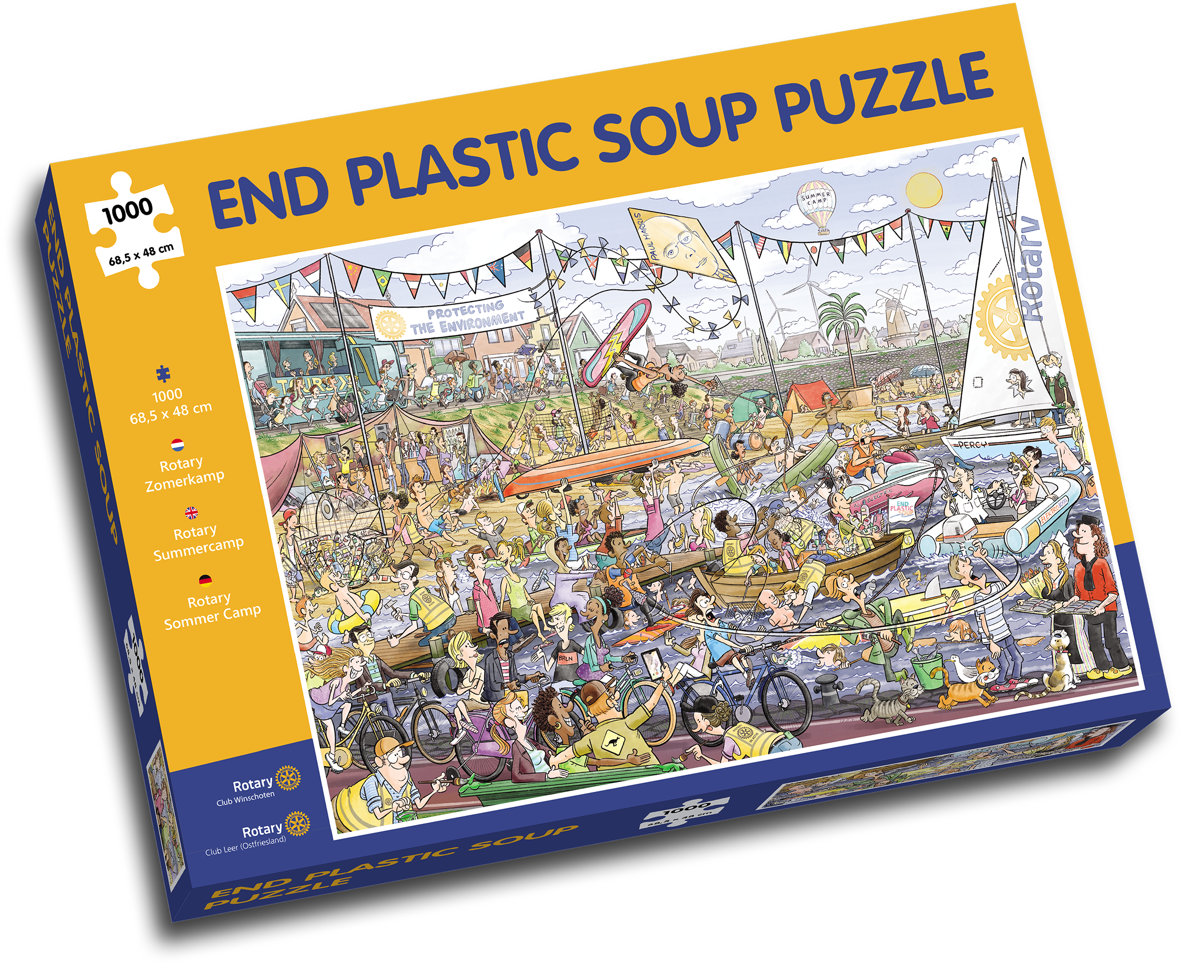 De kerstmannen op de 1.000 stukjes tellende puzzel zijn vervangen voor activiteiten die te maken hebben met de internationale Rotary Summercamps. Vrolijke jongeren uit allerlei landen vermaken zich uitstekend op en om het water. Potze: “Dat past bij ons doel. Jaarlijks verdwijnt er wereldwijd ruim acht miljard kilo plastic afval in de zeeën en oceanen. De opbrengst van onze actie gaat daarom weer naar de ANBI stichting EndPlasticSoup, voor de ontwikkeling van projecten die voorkomen dat plastic in de zee stroomt. Dit sluit ook goed aan bij het internationale thema van Rotary wereldwijd: Protecting the Environment.”