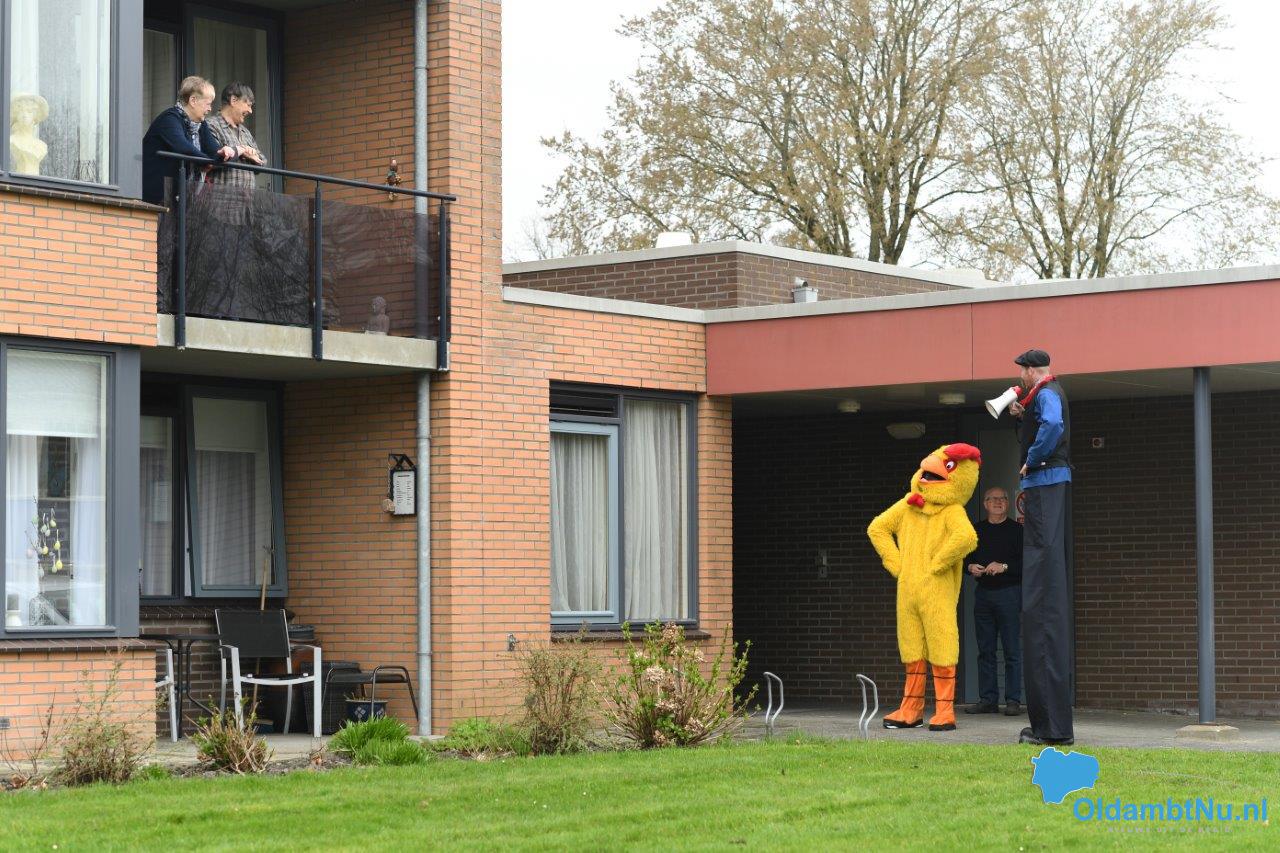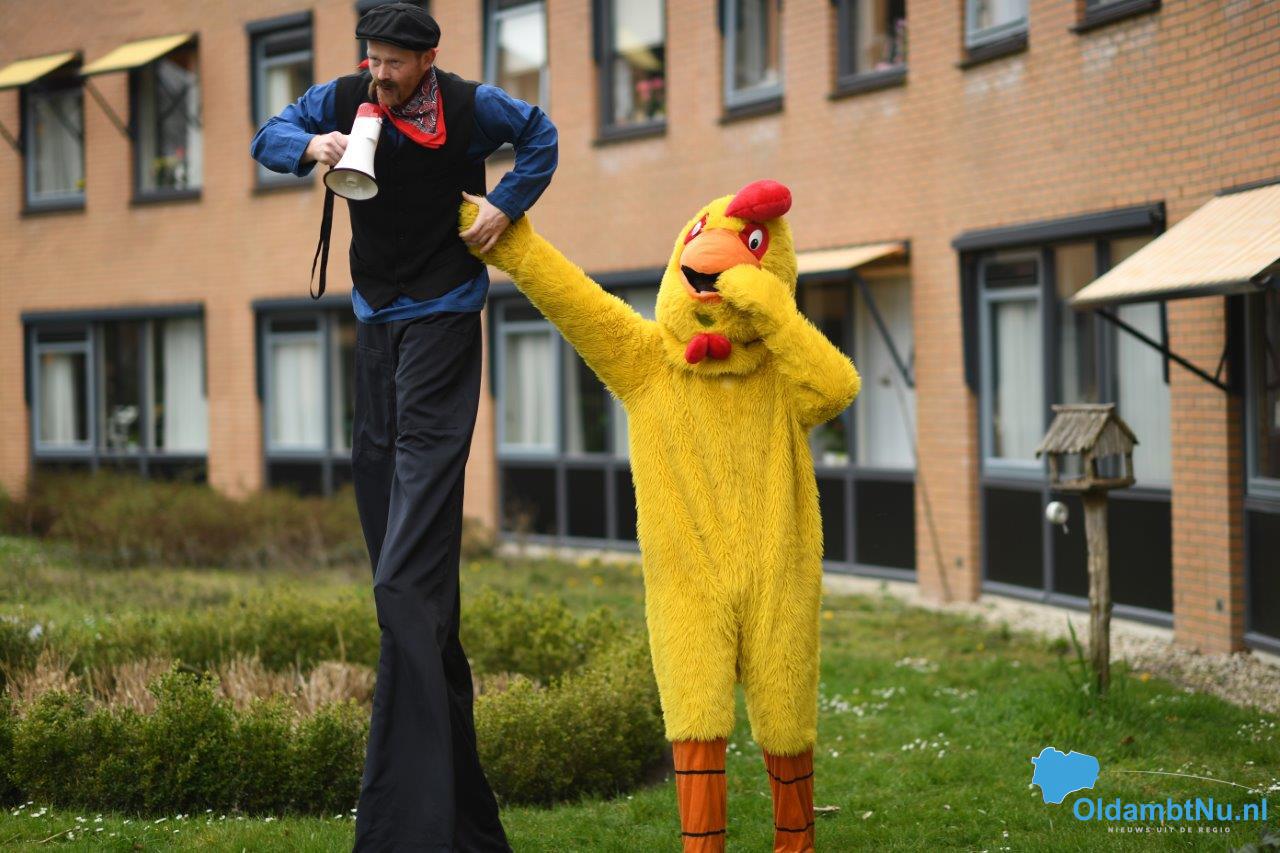 Op stelten ging een boer achter zijn kip aan. Bewoners reageerden enthousiast en er werd uitbundig gezwaaid naar de boer en de kip. Even een leuke afleiding in deze tijd, waarin een lach zeker, op 1 april. heel belangrijk is.