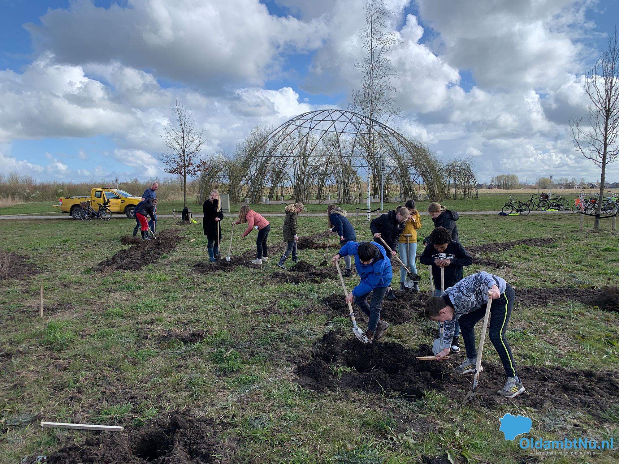 Daarna is het tijd om de handen uit de mouwen te steken. Iedereen krijgt een schep van de boomfeestdag. Eerst wordt de grond omgespit, in banen die samen een ster vormen. Daarna worden de plantjes in de grond gestopt. Een mooie mix van aalbessen, kruisbessen, frambozen en bramen, die samen zullen uitgroeien tot een heerlijk bessenbos.