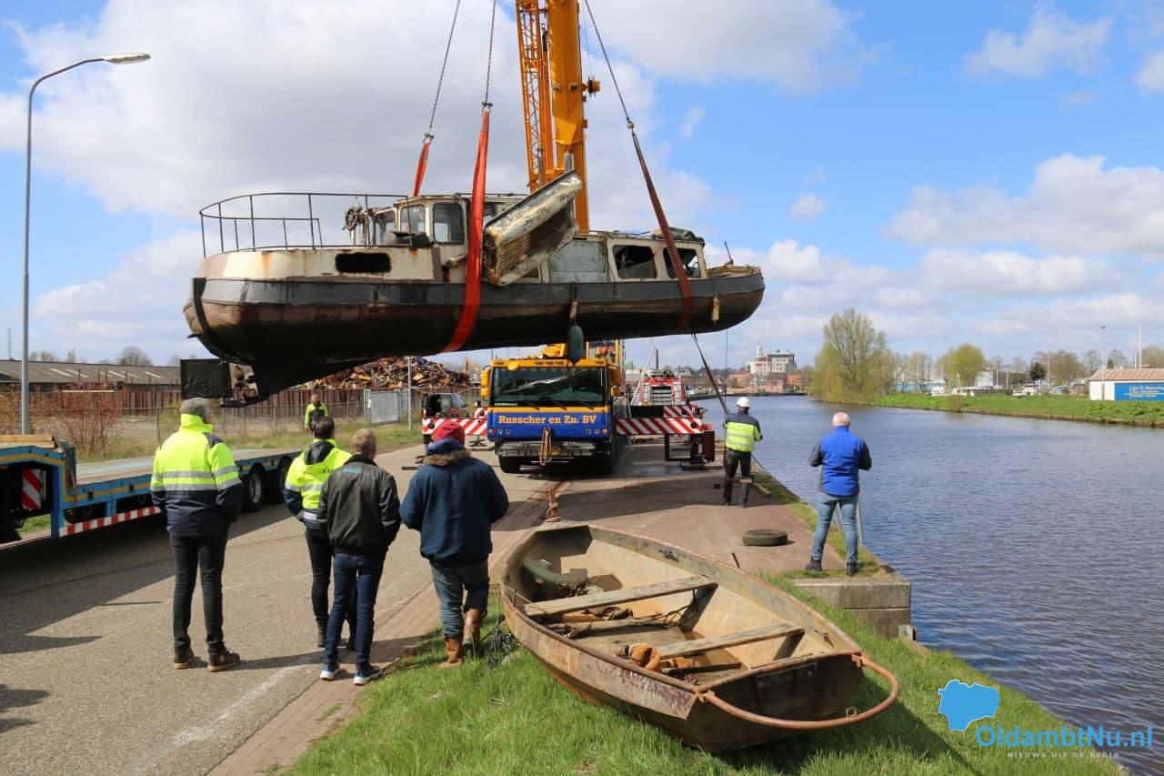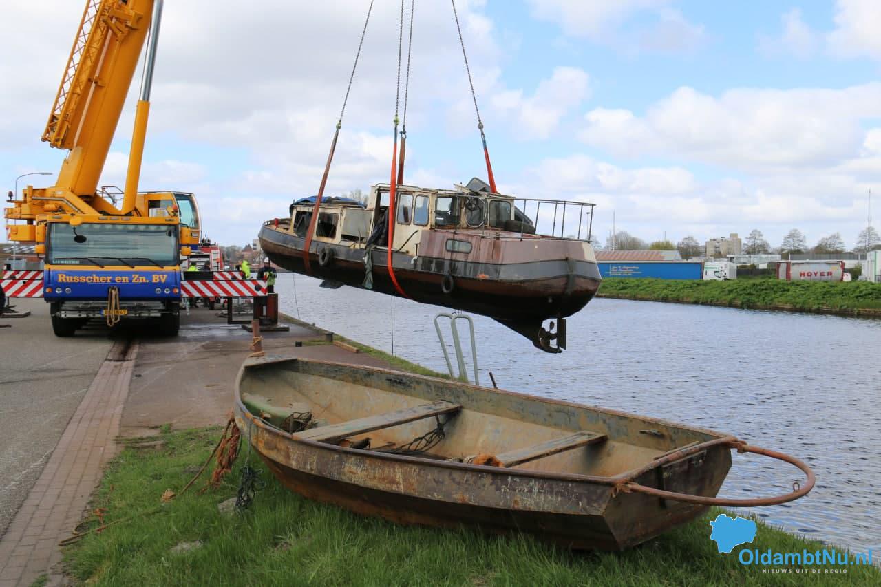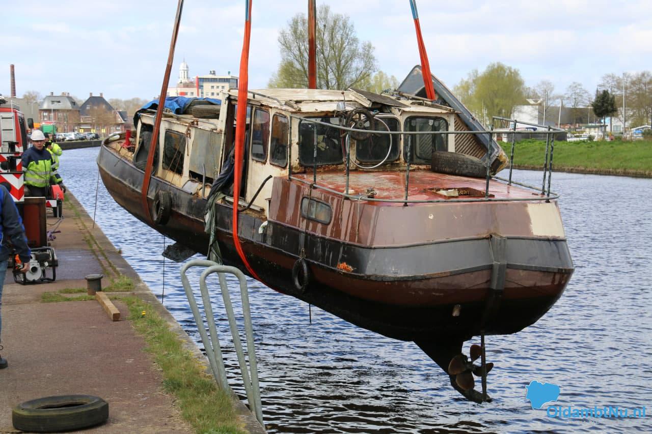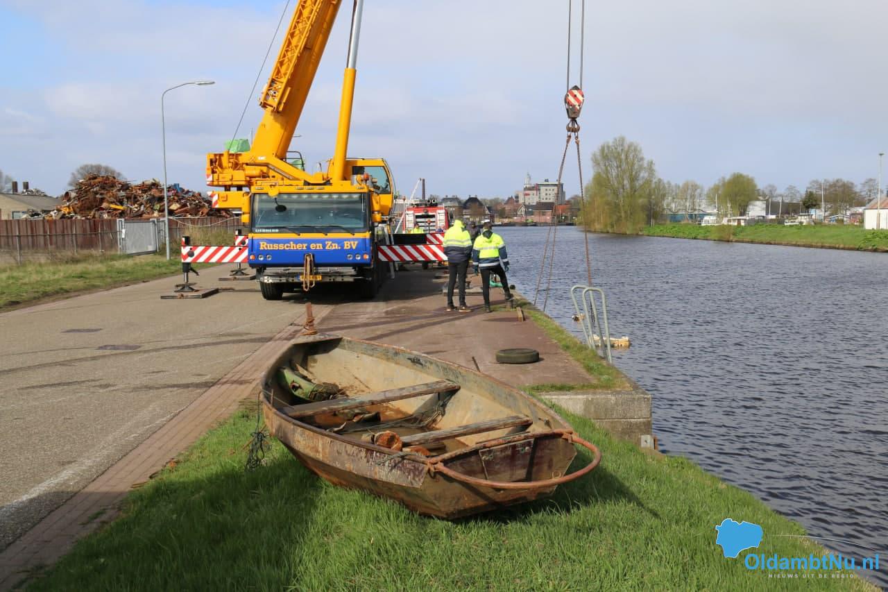 Gezonken boot aan de Renselkade in Winschoten geborgen