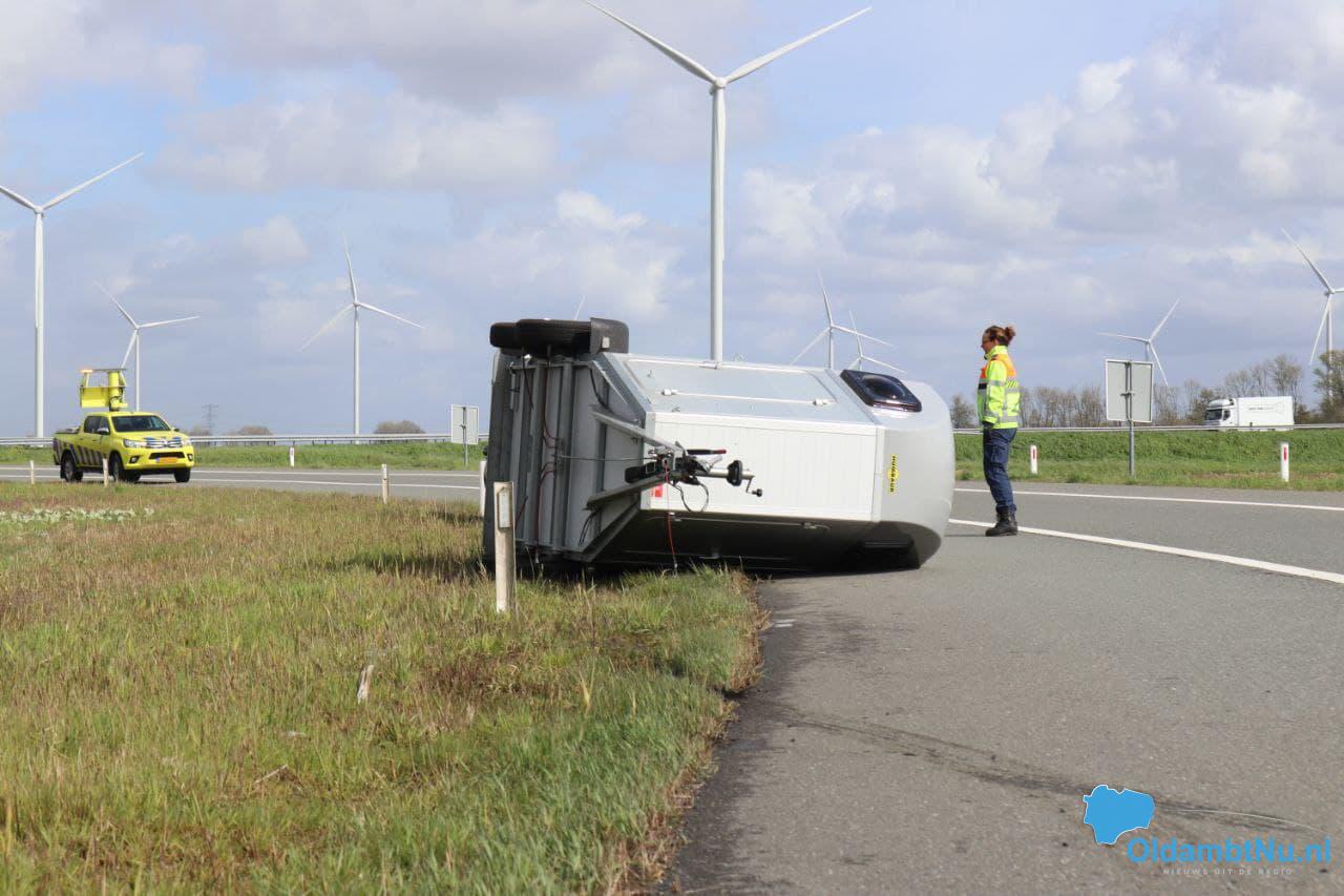 Zuidbroek – Op de oprit van de N33 naar de A7 bij Zuidbroek is woensdagmiddag door de harde wind een paardentrailer gekanteld. De trailer zat achter een auto gekoppeld.