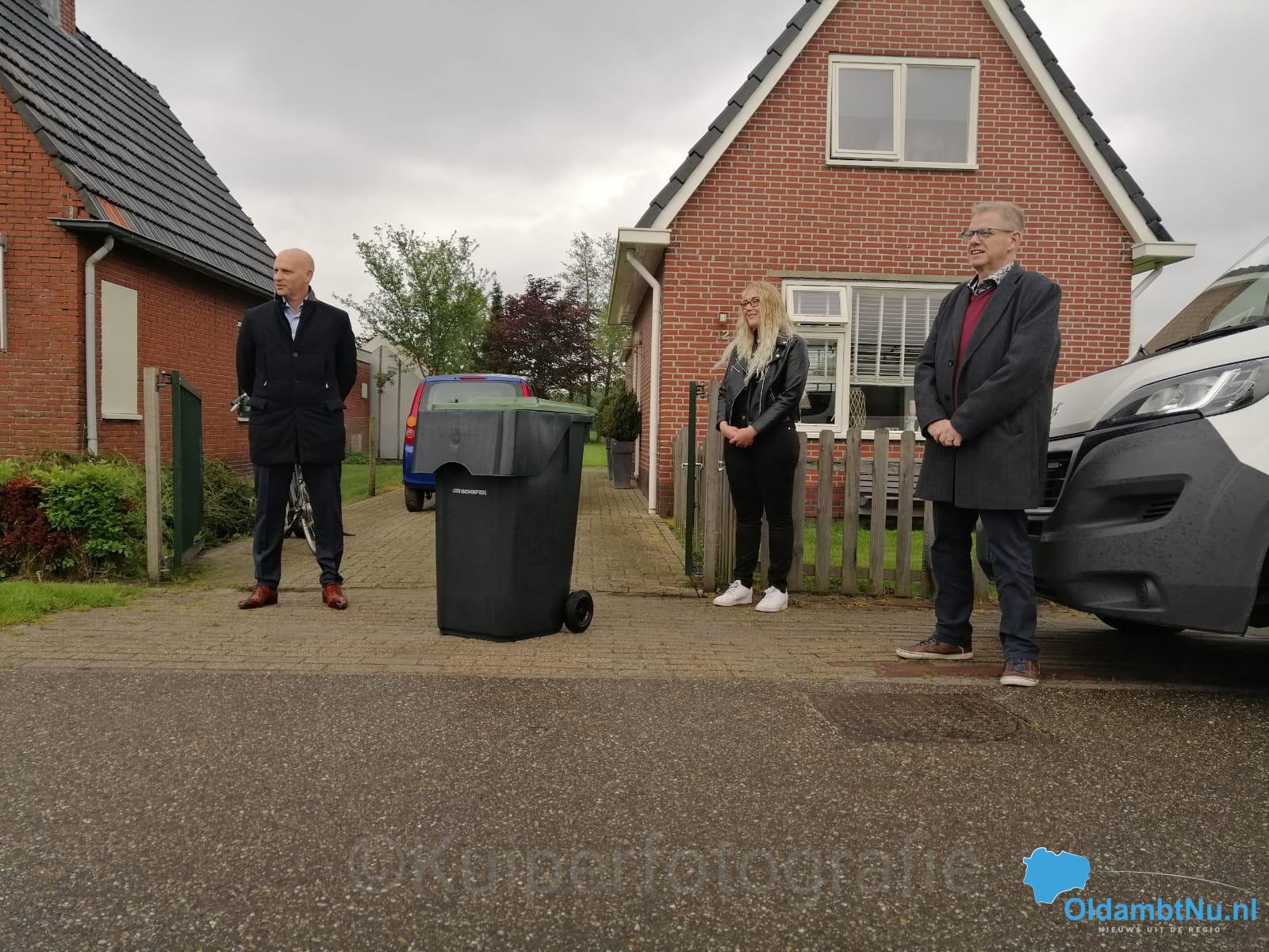 Oldambt –  Gemeente Oldambt heeft nieuwe circulaire afvalcontainers. Wethouder Jurrie Nieboer en Herico Gijzen van SCHÄFER hebben op 26 mei de eerste nieuwe container uitgereikt aan Amanda Vlot uit Heiligerlee.