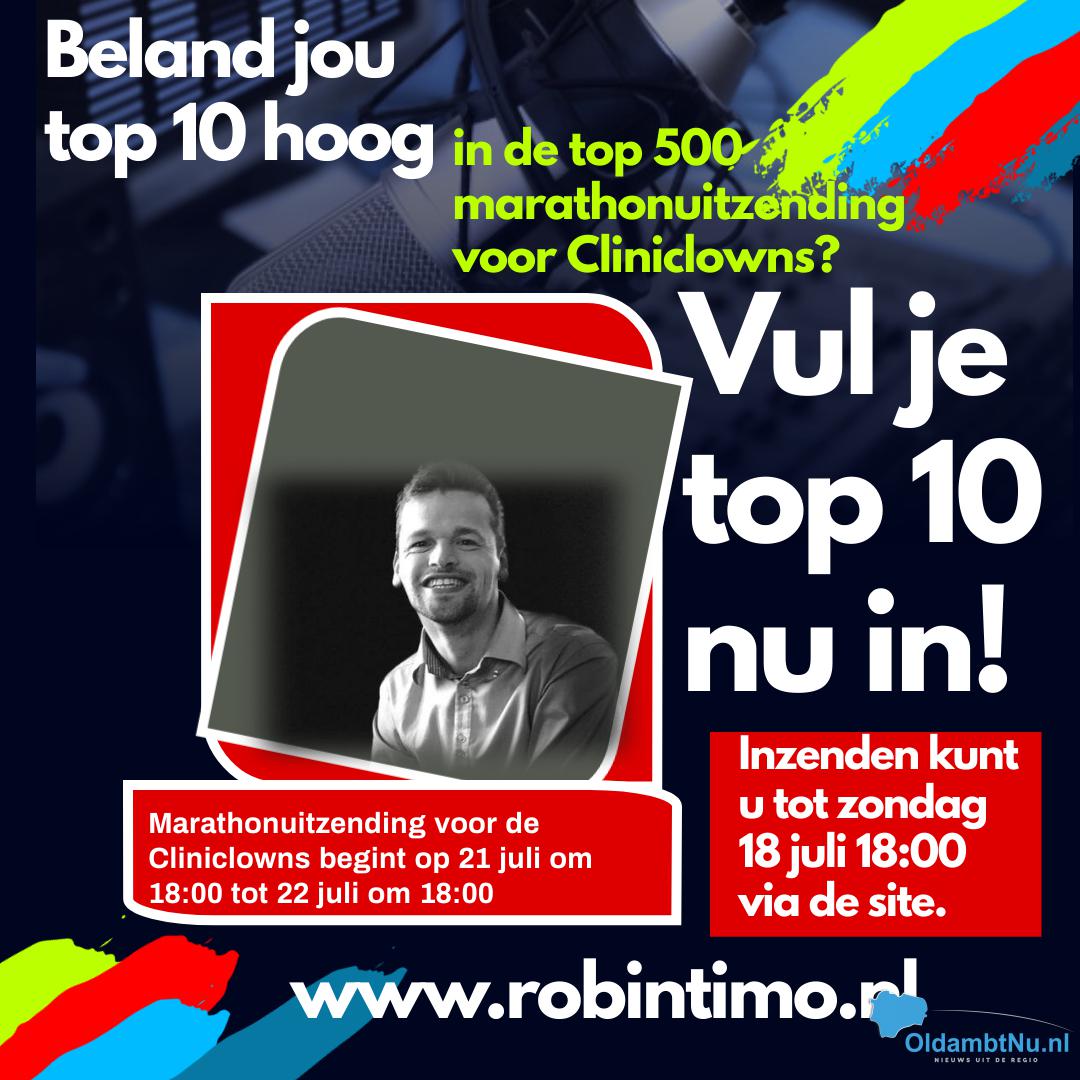 Om deze actie nog meer onder de aandacht te brengen gaan wij een top 500 uitzenden, zorg dat jou top 10 in de lijst komt! (www.robintimo.nl/actie) Vul jou top 10 in (je kunt ook YouTube linkjes gebruiken) Je top 10 word bevestigd zodra je veilig en snel via de Ideal link €1,50,- betaald hebt wat ten goede komt aan de cliniclowns.