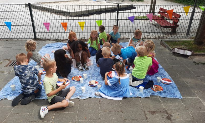 De leerkrachten zien de kinderen genieten deze laatste schooldag en genieten zelf evenhard mee. Tussen de activiteiten door zien de kinderen ineens een ijscoman met schepijs en de dag wordt gezamenlijk afgesloten met een BBQ, nog steeds in kleine bubbels, op het Meester Dekker plein. Dan wordt het toch echt tijd om afscheid van elkaar te nemen. De juffen worden nog even flink verwend en al zwaaiend lopen de kinderen de deur uit, de vakantie tegemoet.