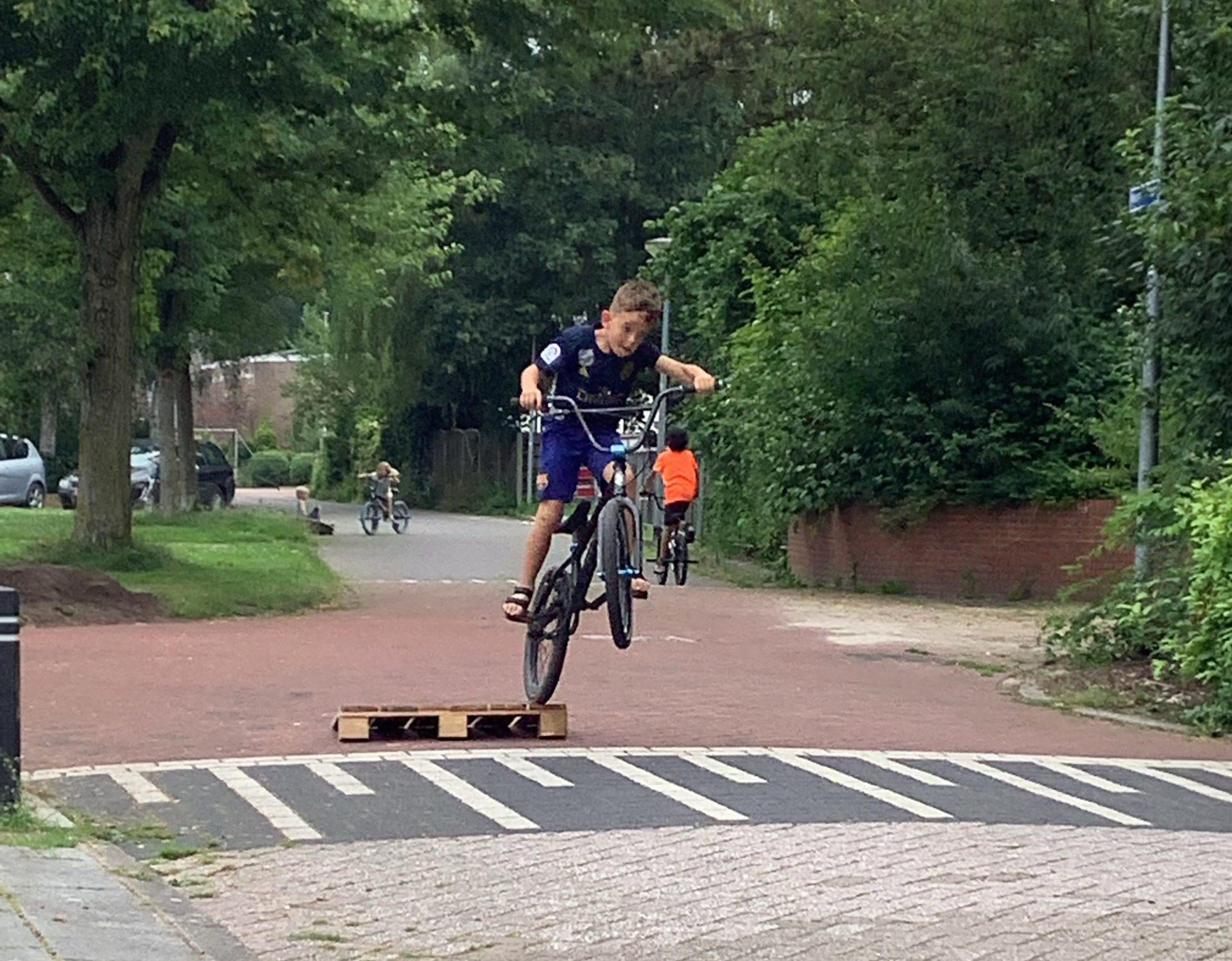 Er is een europallet bijgekomen, iemand heeft deze aangepast en nu is er midden op de weg/straat een springschans. Met veel bravoure en spontane kreten van, “kijk uit, ik kom er aan”, zijn ze met elkaar aan het sparren.