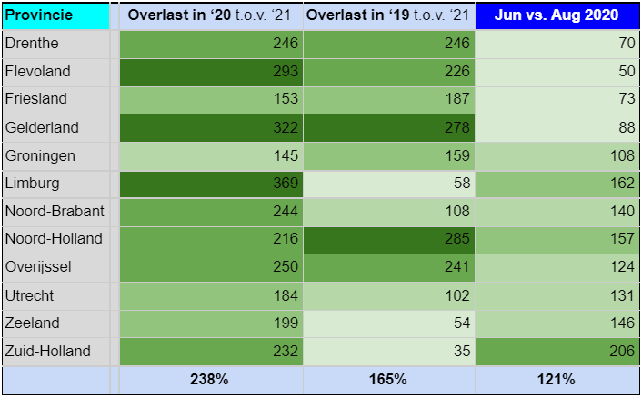 “Eenzelfde ontwikkeling zagen we in 2018”, herinnert Merijn Janssen zich (zie infographic 1). “Het seizoen begon toen wel iets vroeger, maar we zagen een weliswaar korte, maar heel hevige piek in de wespenoverlast en dus -bestrijding. Onze bestrijders konden het toen nauwelijks bijbenen. Dat verwachten we dit jaar dus weer, waarbij het – zoals in alle jaren – per provincie heel anders zal zijn.”