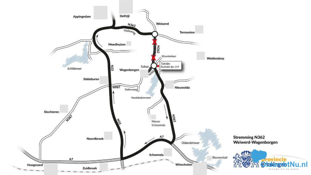 In deze periode rijden de bussen van Qbuzz een aangepaste route. Lijn 119 (Delfzijl-Winschoten via Scheemda) rijdt niet via Wagenborgen. Aan de oostkant van de N362 komt bij Kopaf/ Kloosterlaan een tijdelijke bushalte voor reizigers vanuit Wagenborgen.