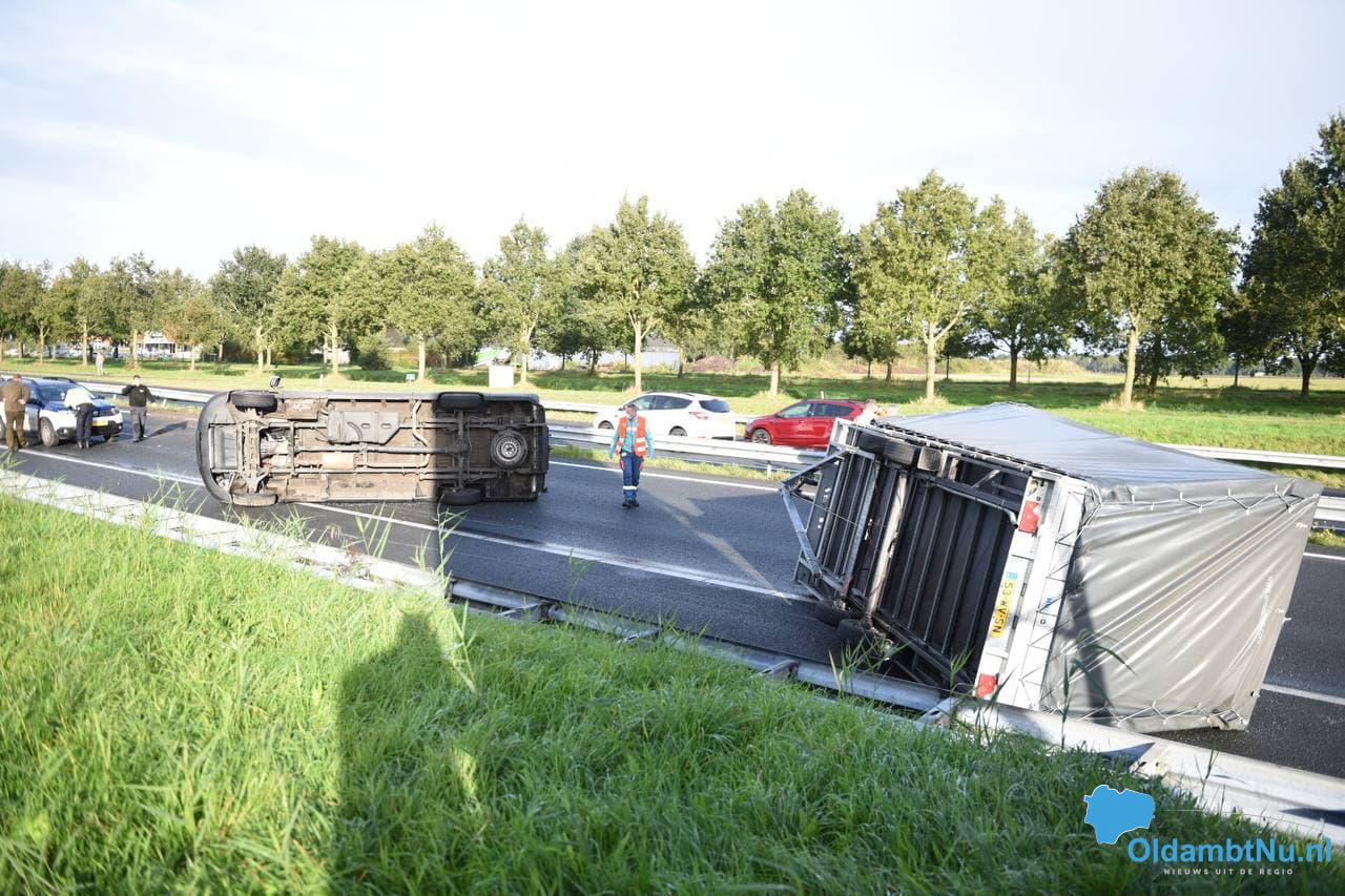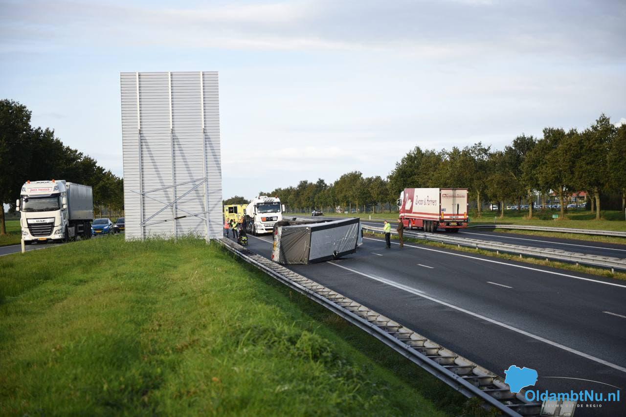 Rijkswaterstaat is ter plekke om de weg af te sluiten en om de gekantelde combinatie zo snel mogelijk weg te krijgen.